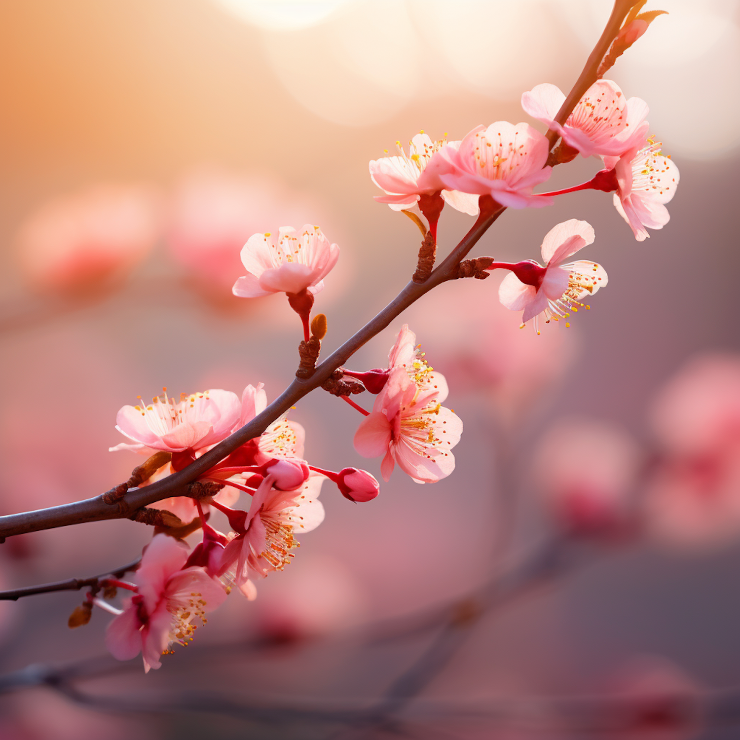 Beautiful pink cherry blossoms in full bloom, illuminated by warm sunlight, creating a serene and dreamy atmosphere.