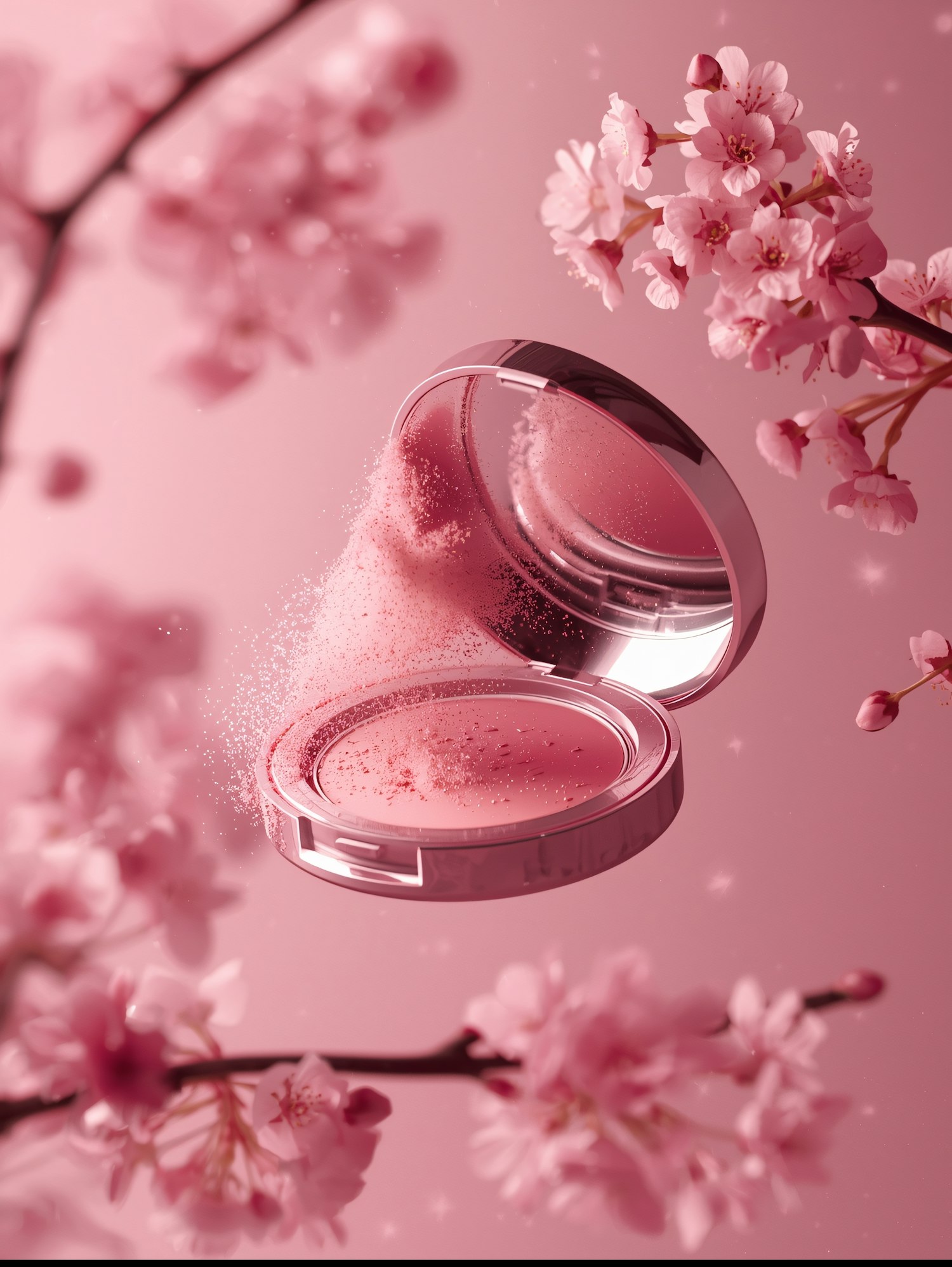 A pink compact powder case surrounded by cherry blossoms, with powder softly dispersing in a dreamy pink background.