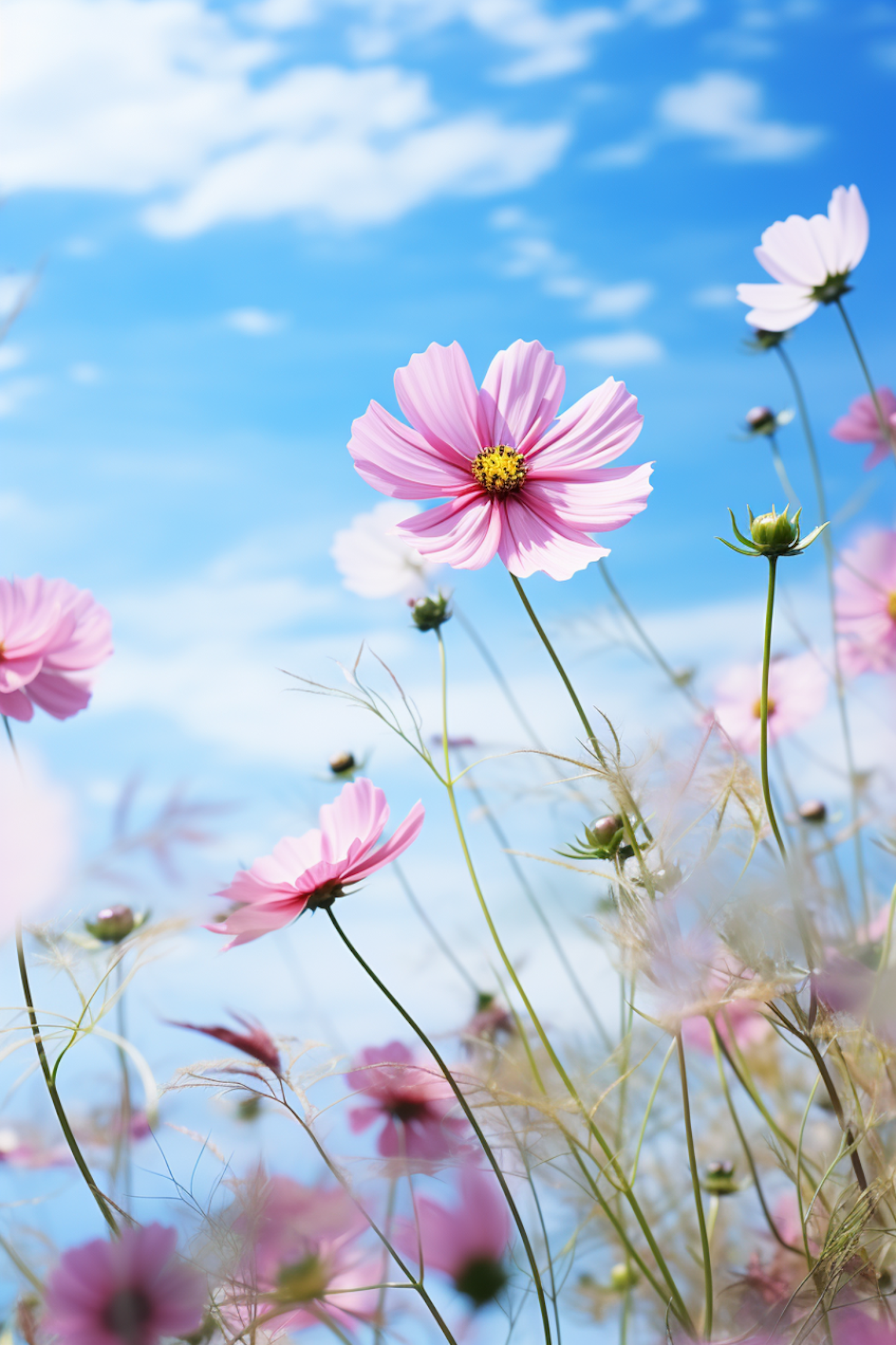 Pink cosmos flowers against a bright blue sky, creating a serene and dreamy meadow scene.
