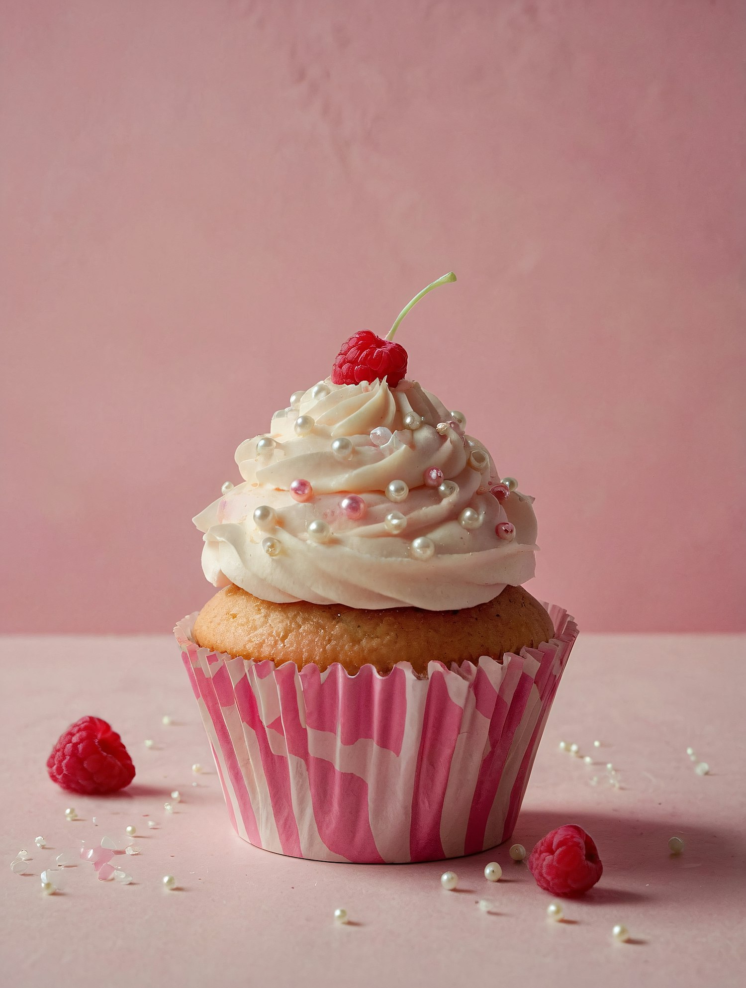 Delicate pink cupcake with swirled frosting, edible pearls, and a raspberry-cherry topper, set against a soft pink background.