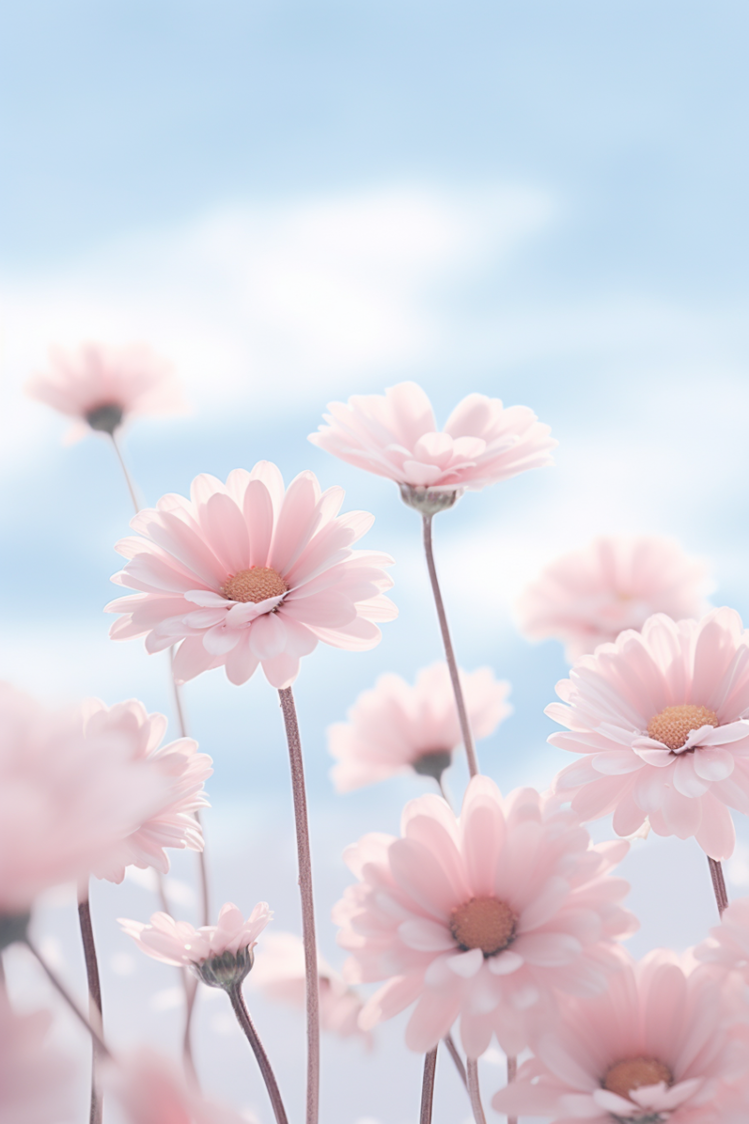 Soft pink daisies bloom against a serene blue sky, creating a dreamy and tranquil floral scene.