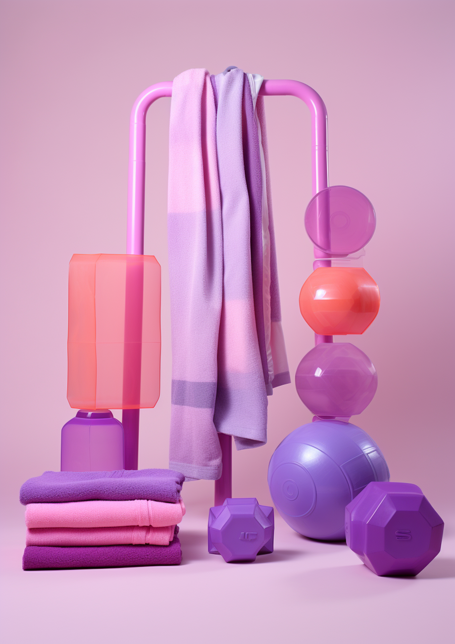 Pastel fitness gear with pink and purple towels, weights, and exercise ball on a pink background. Stylish and calming setup.