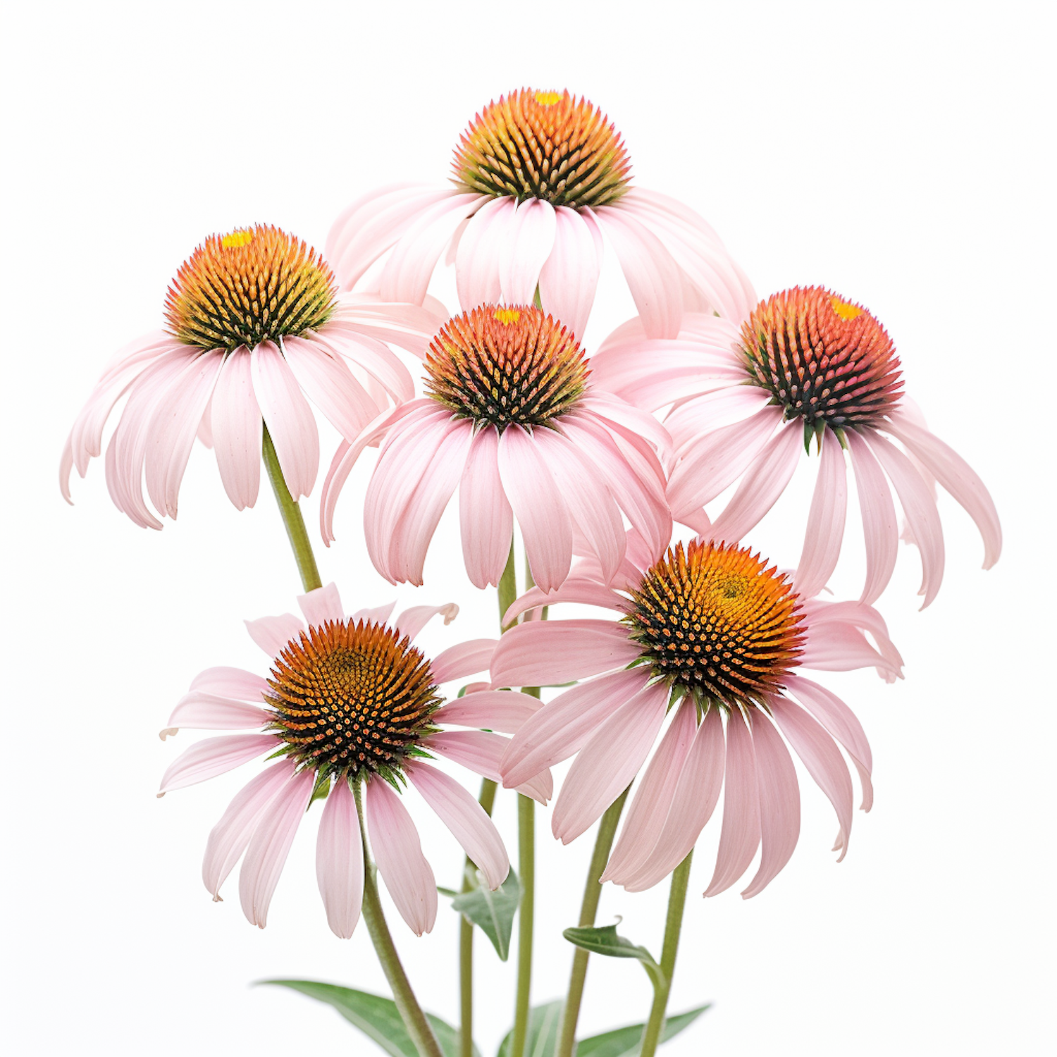 Beautiful pink echinacea flowers with orange-green centers on a white background, showcasing their delicate petals and vibrant details.
