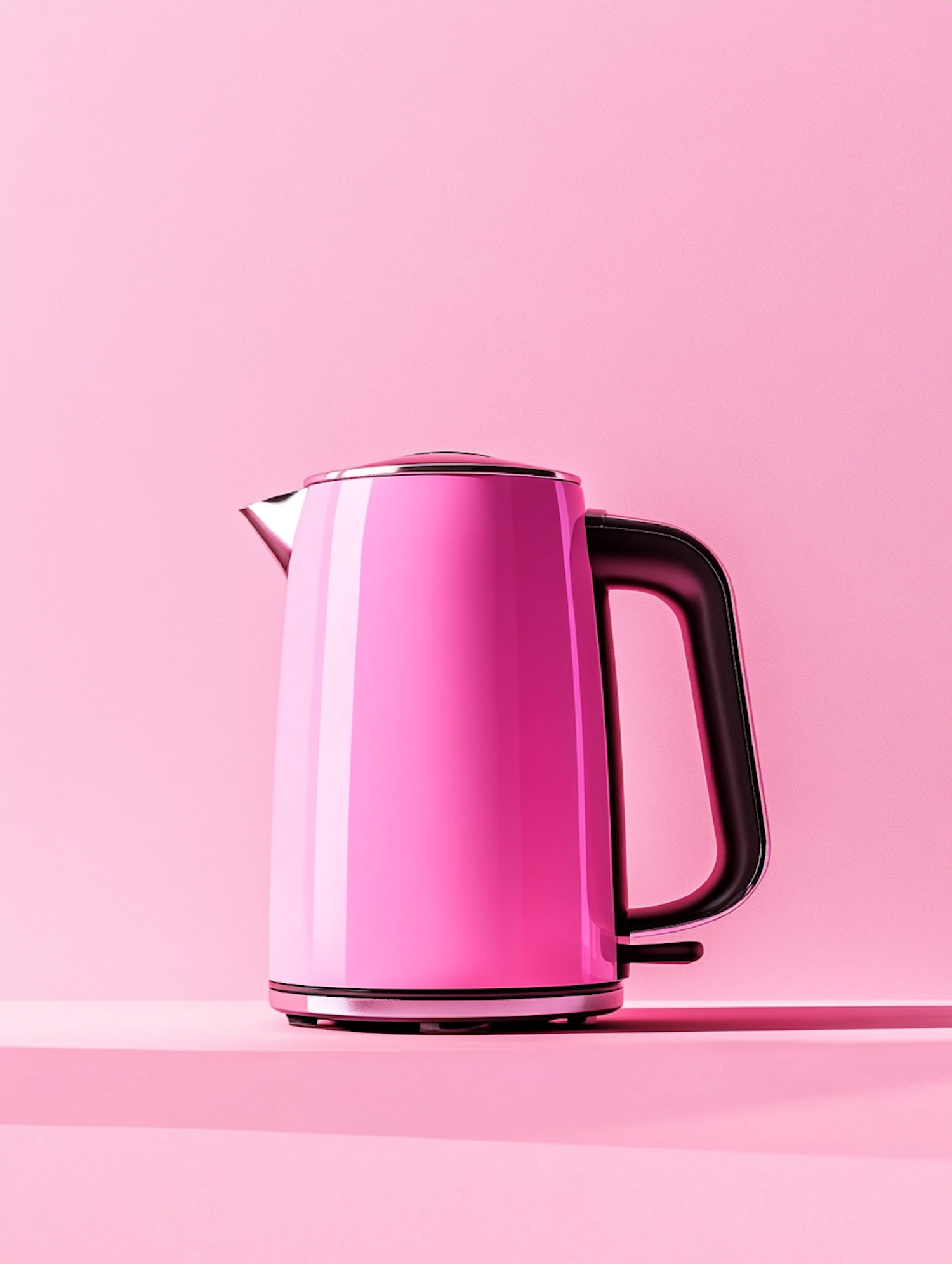 A vibrant pink electric kettle with a glossy finish and black handle, set against a matching pink background for a bold, modern look.