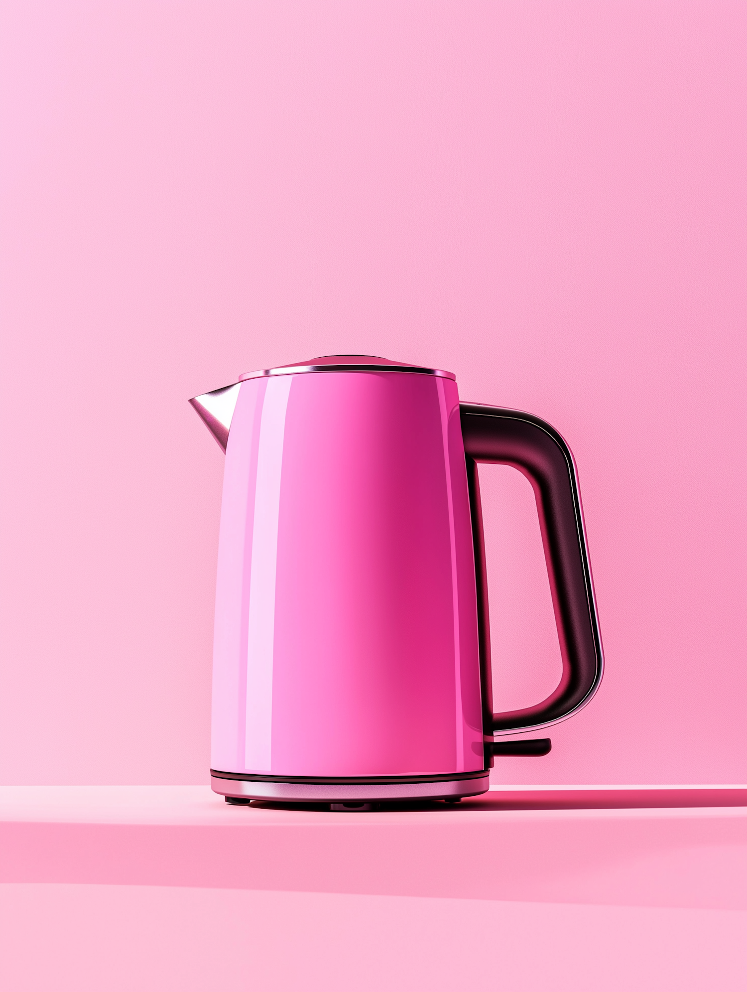 A stylish pink electric kettle with a glossy finish and black handle, set against a matching pink background for a bold, modern look.