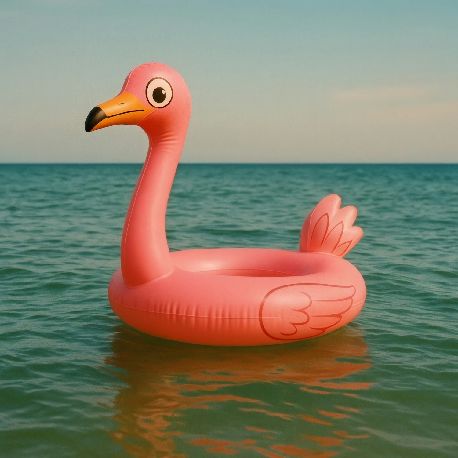 Bright pink flamingo float resting on turquoise ocean waters under a sunny sky, perfect for a relaxing day at the beach.