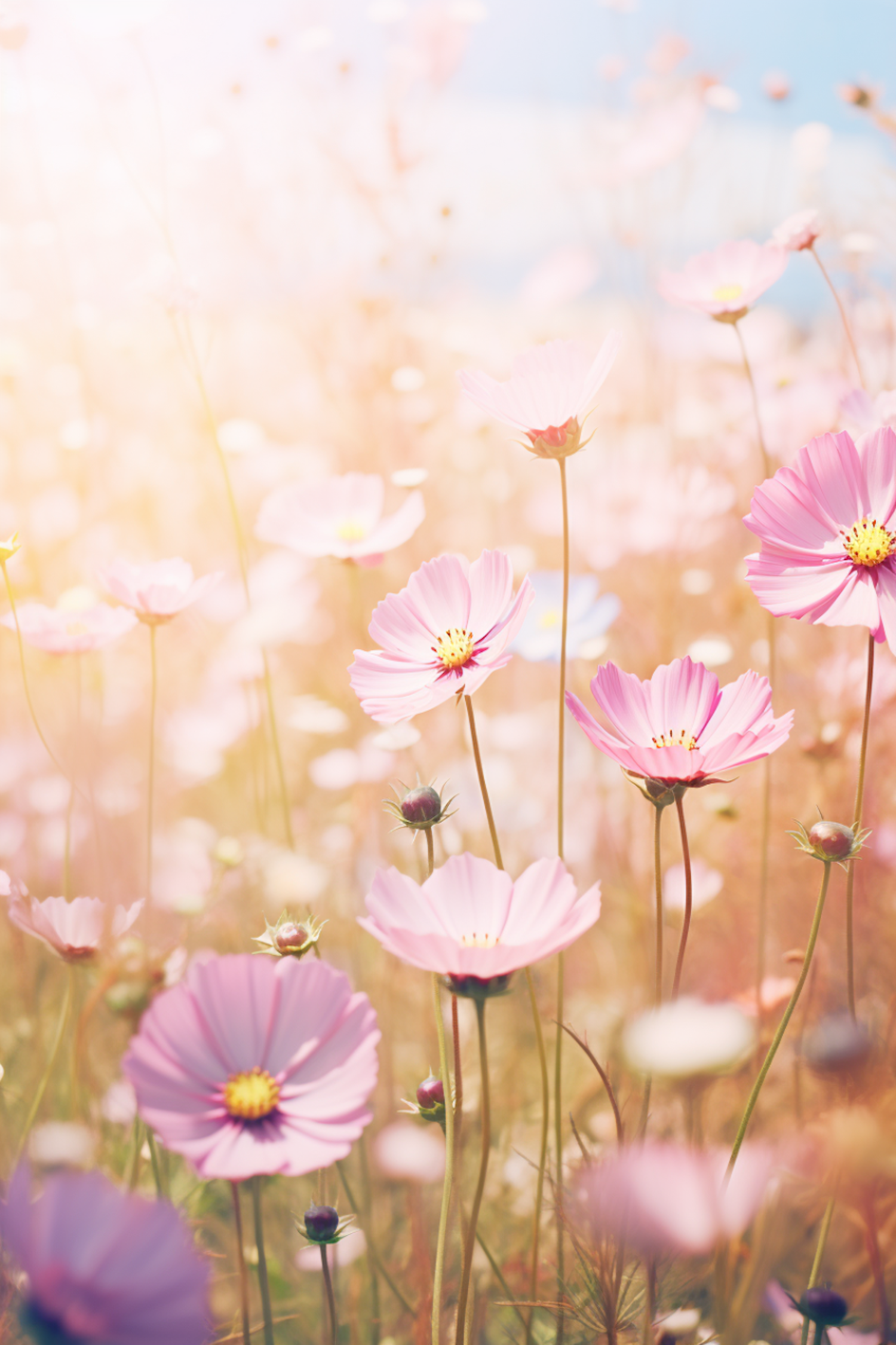 A dreamy field of pink cosmos flowers in warm sunlight, creating a serene and ethereal atmosphere with soft pastel hues.