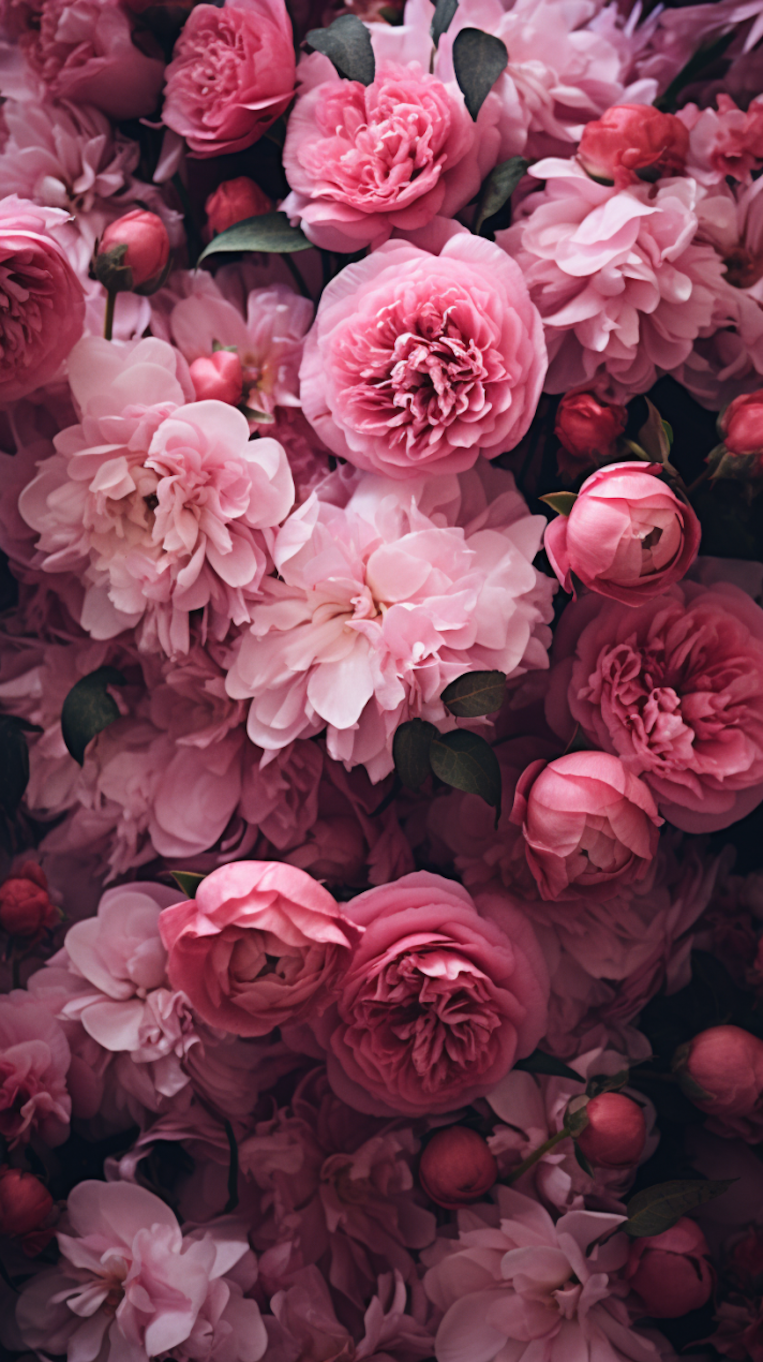 A lush arrangement of pink roses and peonies in full bloom, showcasing vibrant shades and intricate petal details.