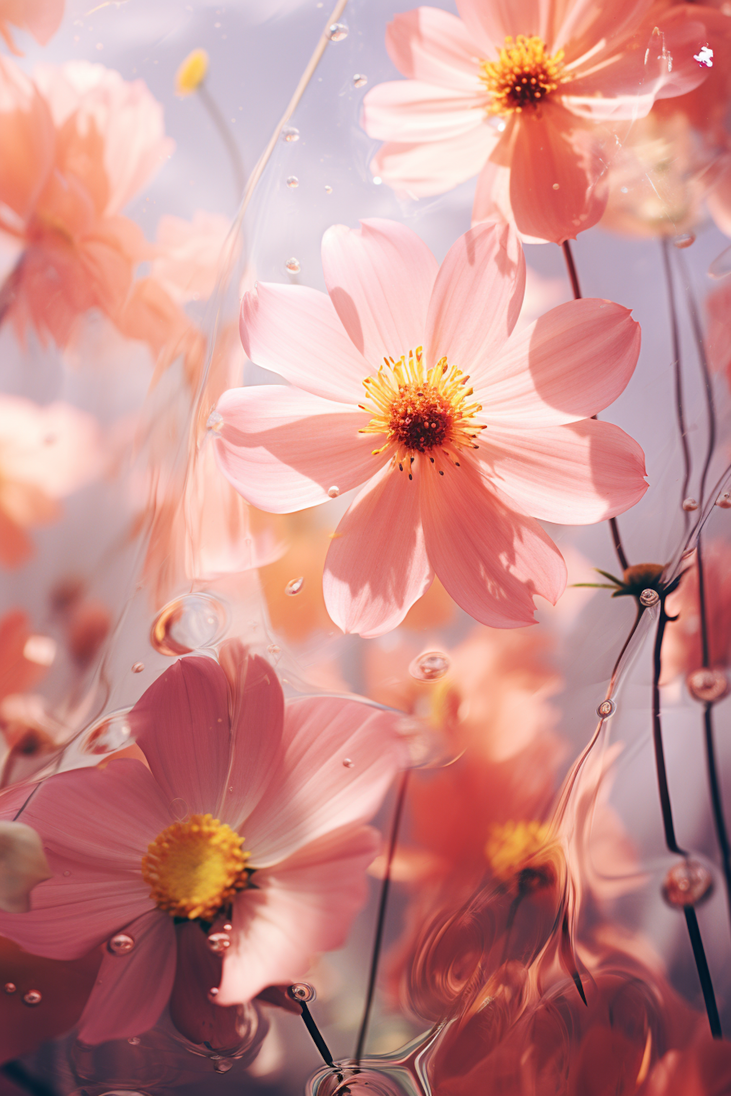 Dreamy pink cosmos flowers with dewy petals and soft lighting create an ethereal and serene floral scene.