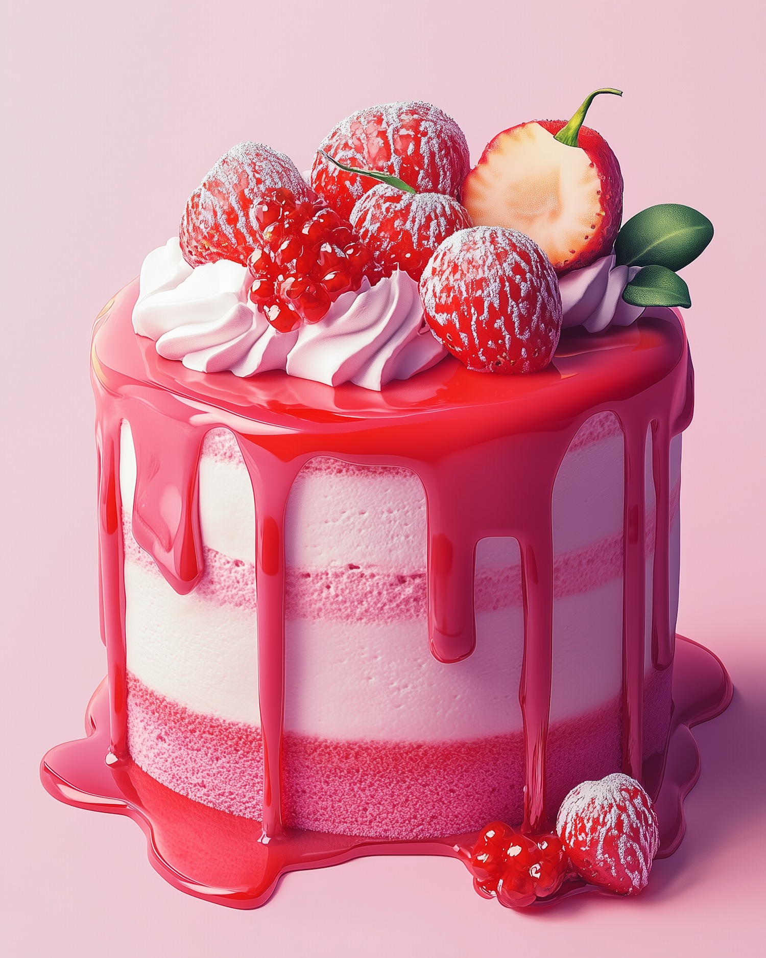 Delicious pink cake with glossy glaze, fresh strawberries, and red currants on a soft pink background.