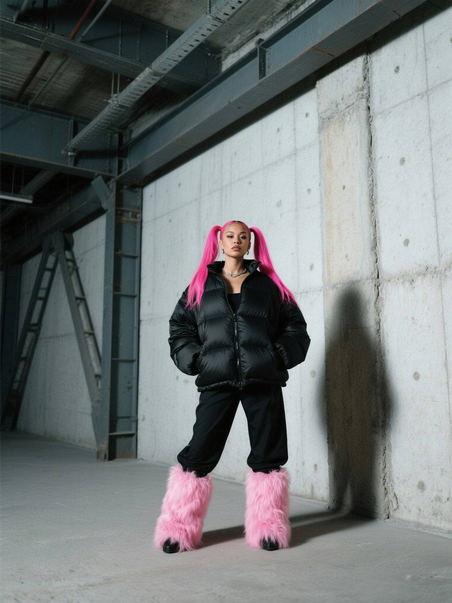 chic baddie in black puffer jacket and pants, bright pink twin ponytails, bubblegum pink fluffy boots, industrial interior architecture backdrop, dramatic lighting