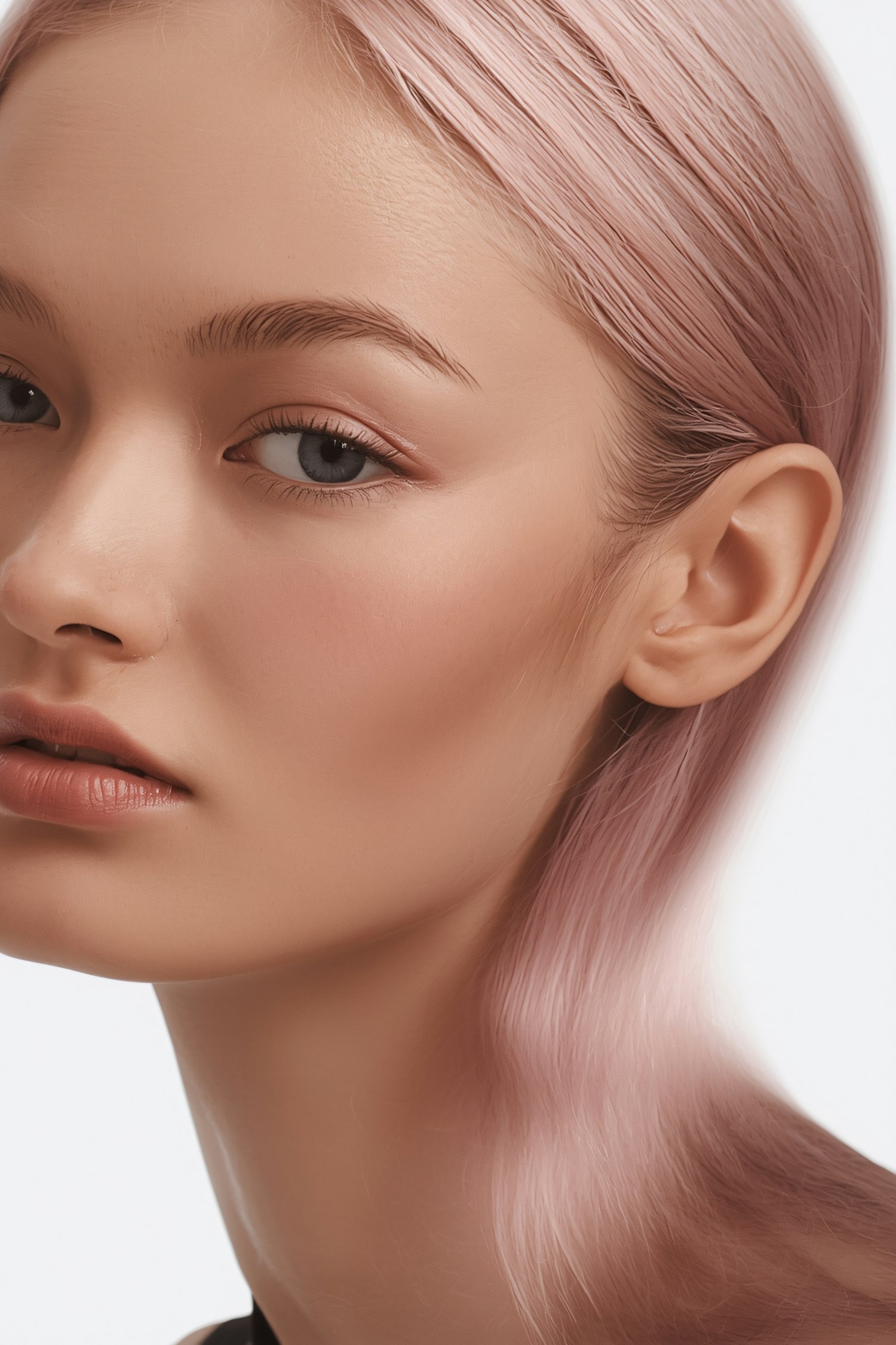 Close-up of a person with pink hair and light skin, showcasing smooth skin and subtle makeup against a plain white background.
