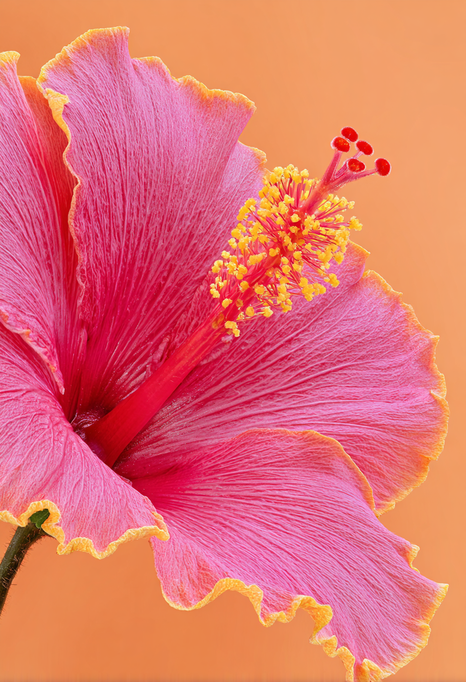 Close-up of a bright pink hibiscus with detailed petals and yellow stamen on an orange backdrop.