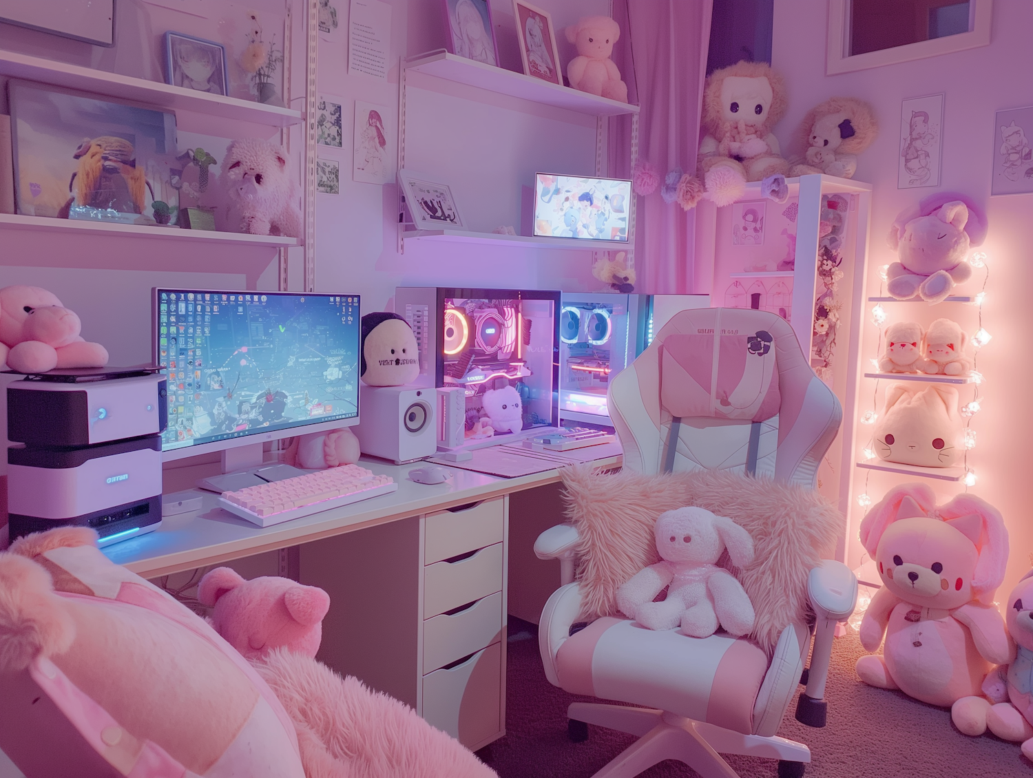Charming pink-themed gaming setup with plush toys, dual monitors, and cozy lighting, creating a cute and inviting atmosphere.
