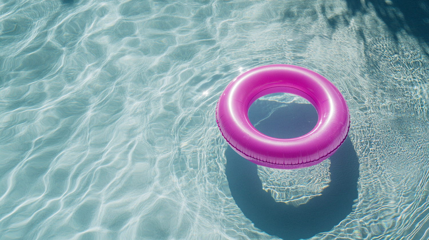 A bright pink inflatable ring floats on a clear blue pool, creating a serene and inviting summer scene.