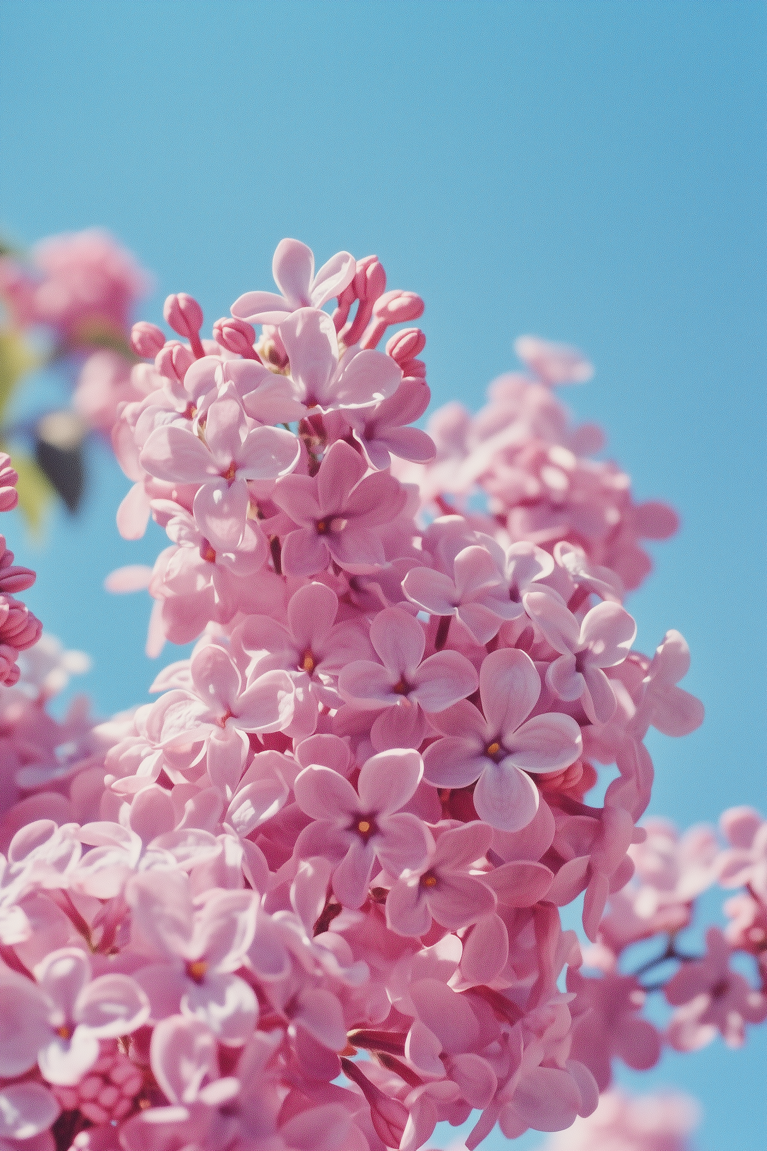 Close-up of pink lilac flowers in full bloom against a bright blue sky, showcasing their delicate petals and vibrant colors.