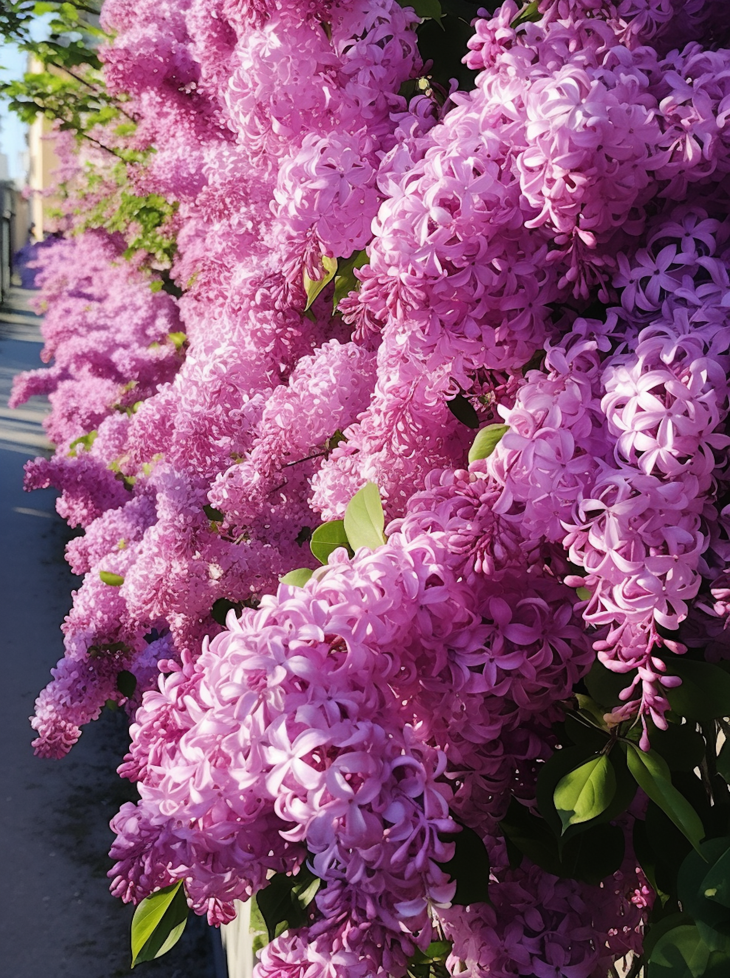 Vibrant lilac flowers in full bloom along a sunlit pathway, showcasing rich purple hues and lush green leaves.