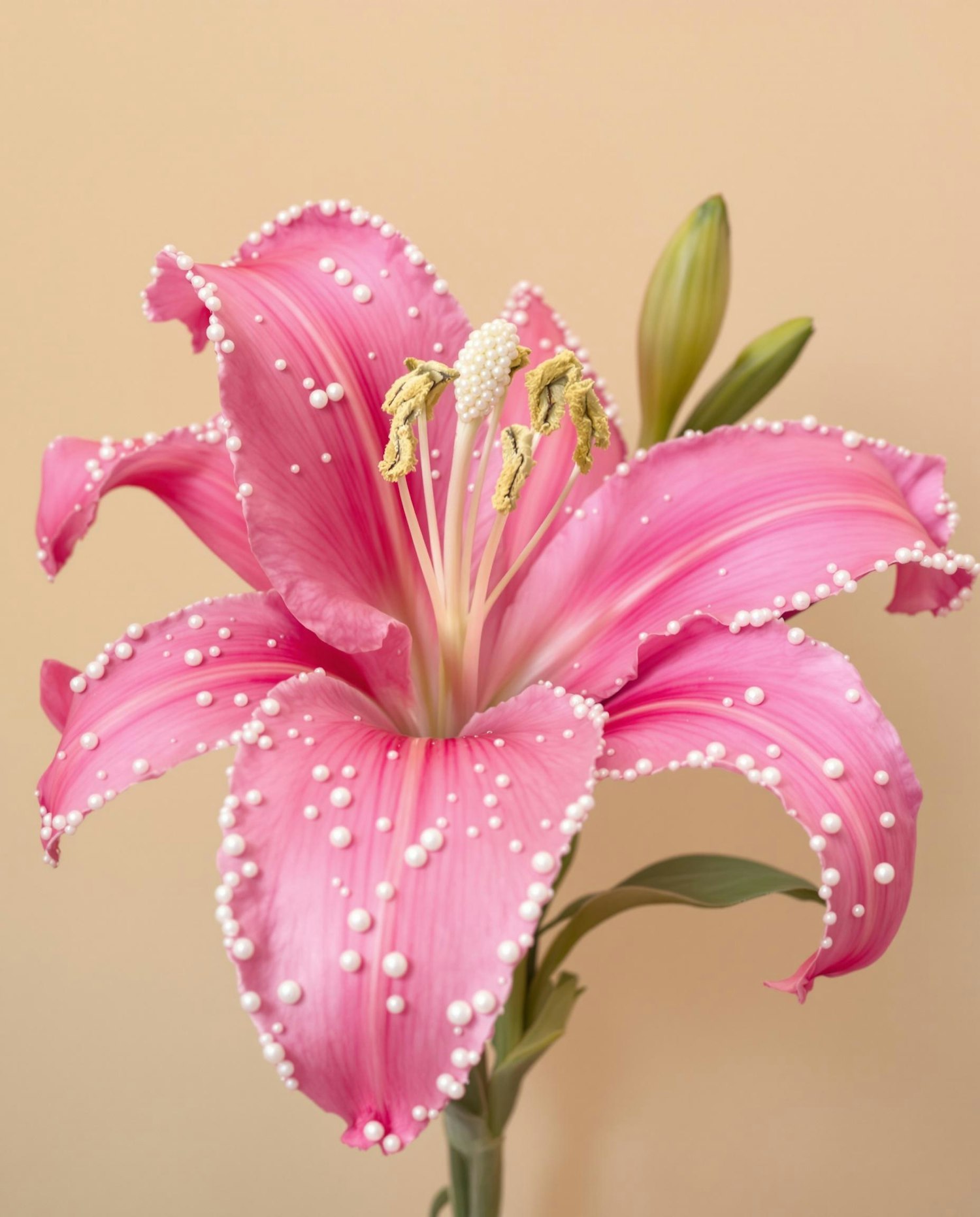 A stunning pink lily with pearl-like decorations on its petals, set against a soft beige background for a delicate and artistic look.