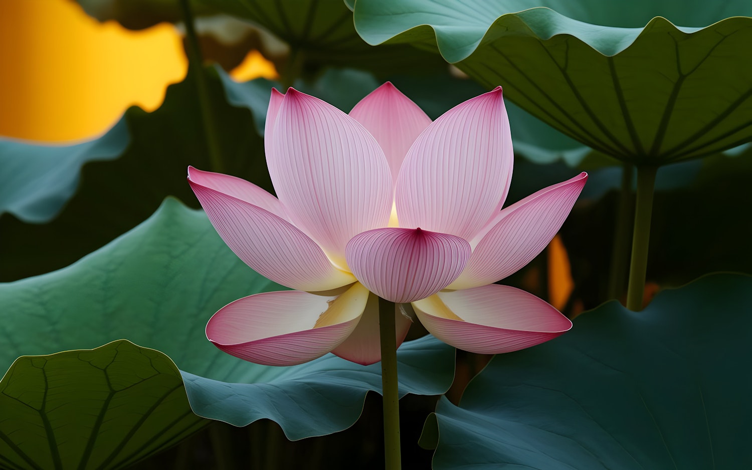 A stunning pink lotus flower in full bloom surrounded by lush green leaves, set against a warm yellow-orange background.