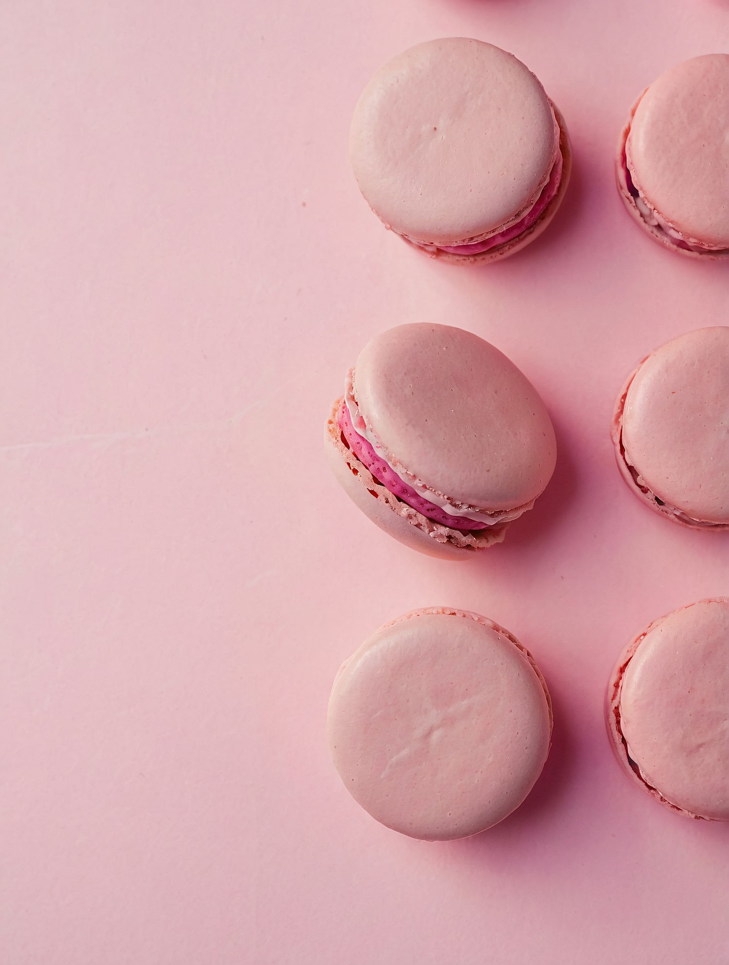 Delicate pink macarons with vibrant cream filling on a pastel pink background, perfect for dessert lovers and aesthetic inspiration.