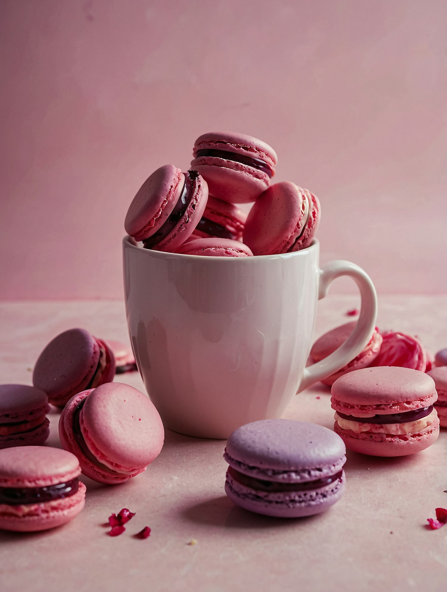 A white mug filled with pink macarons, surrounded by pink and lavender macarons on a pastel pink surface with scattered petals.