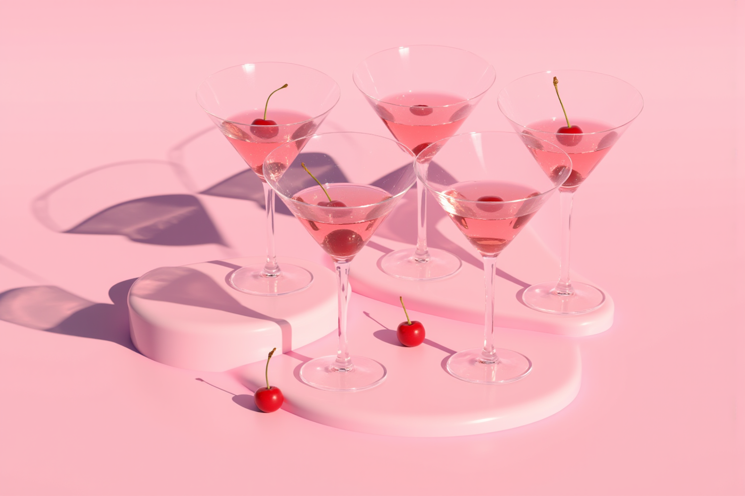Five martini glasses with pink drinks and cherries on a pink surface, creating a vibrant and stylish aesthetic.
