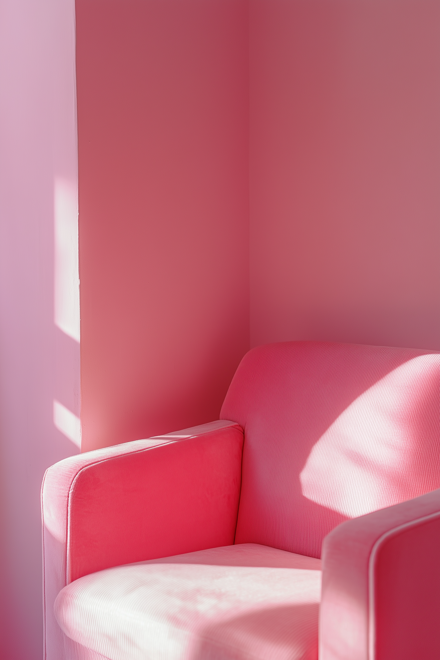 A pink armchair in a corner with matching pink walls, bathed in soft natural light for a minimalist and cozy aesthetic.