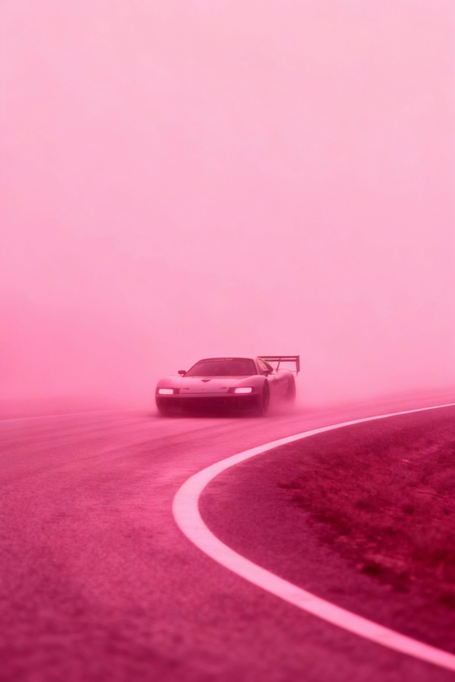 A sleek sports car drives through a pink mist on a curved road, creating a surreal and dynamic scene with a unique color palette.
