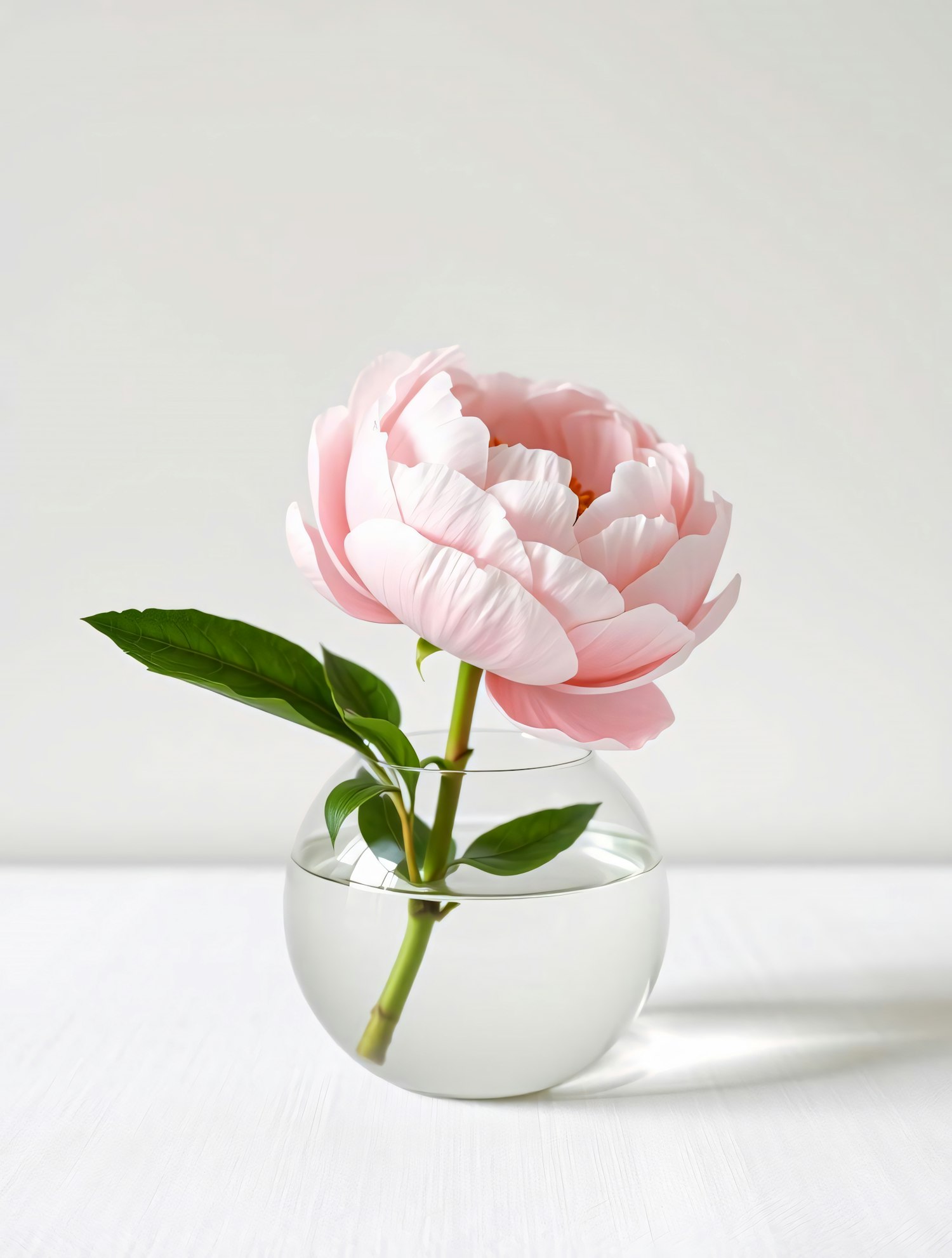 A soft pink peony in a round glass vase on a white surface, creating a minimalistic and serene floral arrangement.