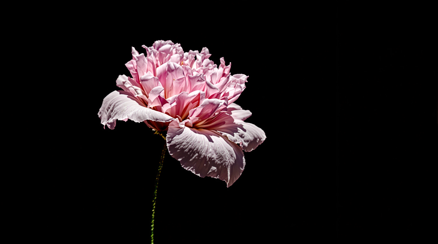 Elegant pink peony in full bloom against a black background, highlighting its delicate petals and vibrant colors.