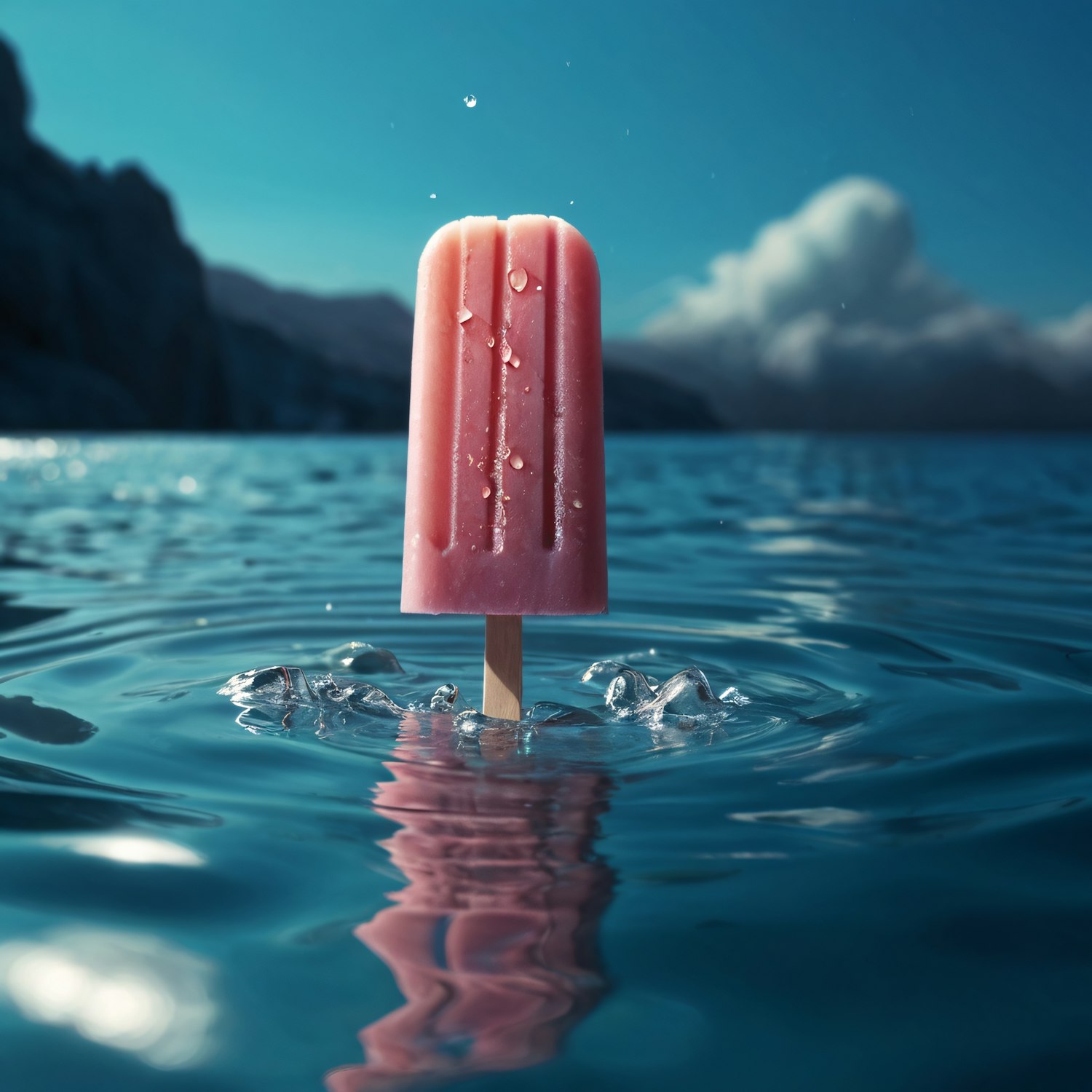 A pink popsicle stands in a serene blue lake, surrounded by ripples, under a clear sky with mountains in the background.