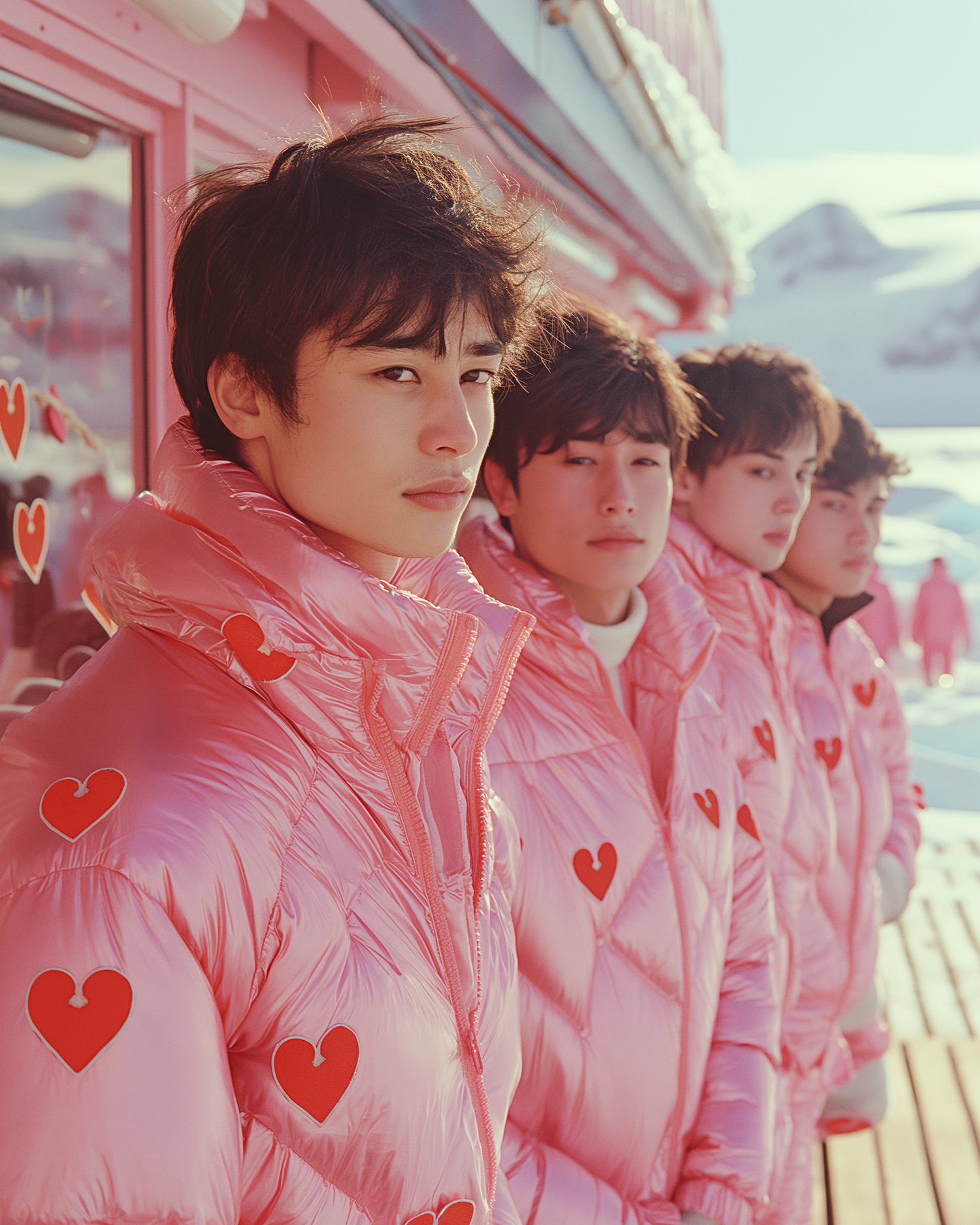 Four young men in pink heart-adorned jackets stand in a snowy landscape, blending fashion with a winter wonderland.