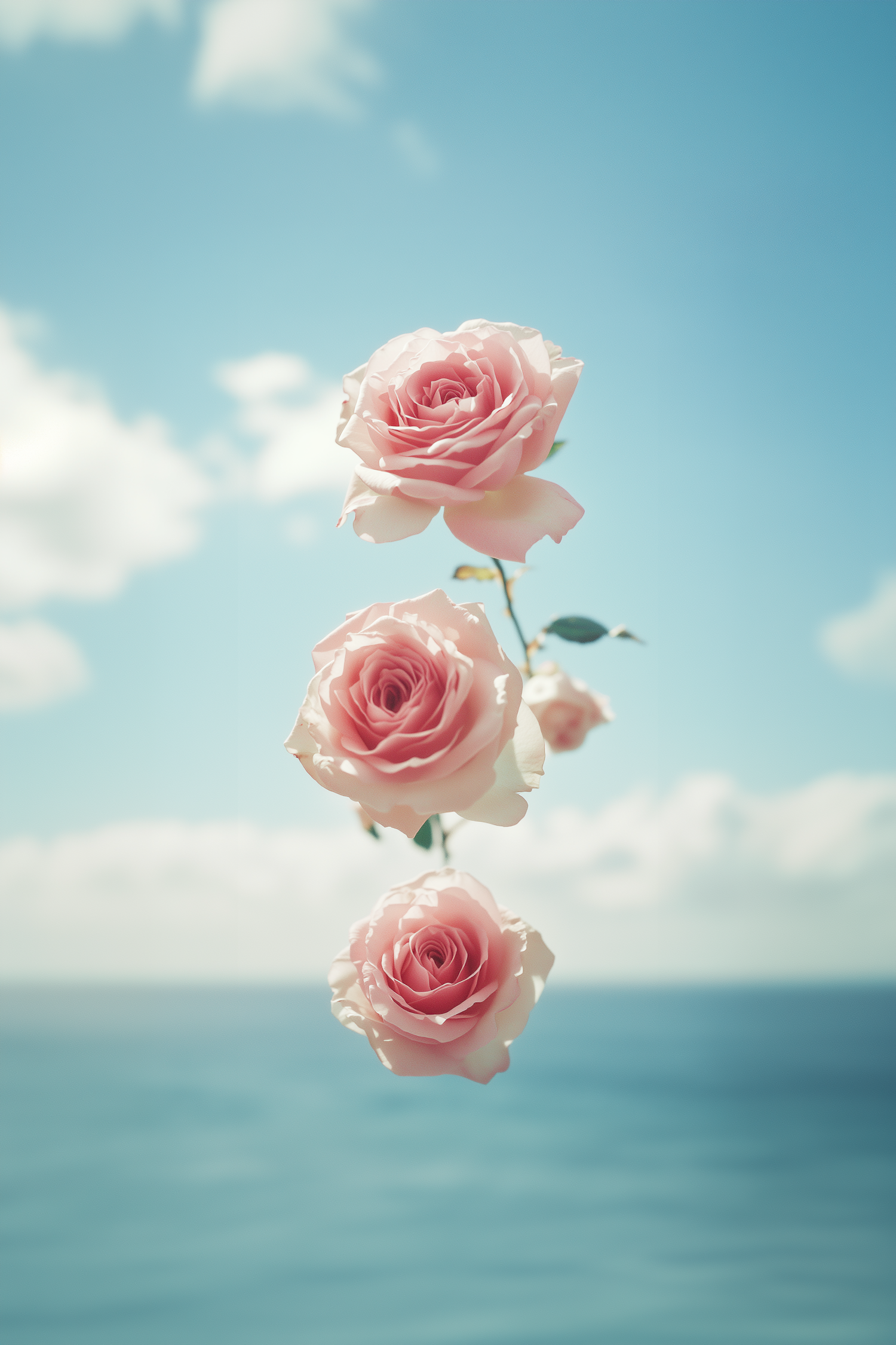 Three pink roses in full bloom float against a serene blue sky and ocean backdrop, creating a dreamy and tranquil scene.