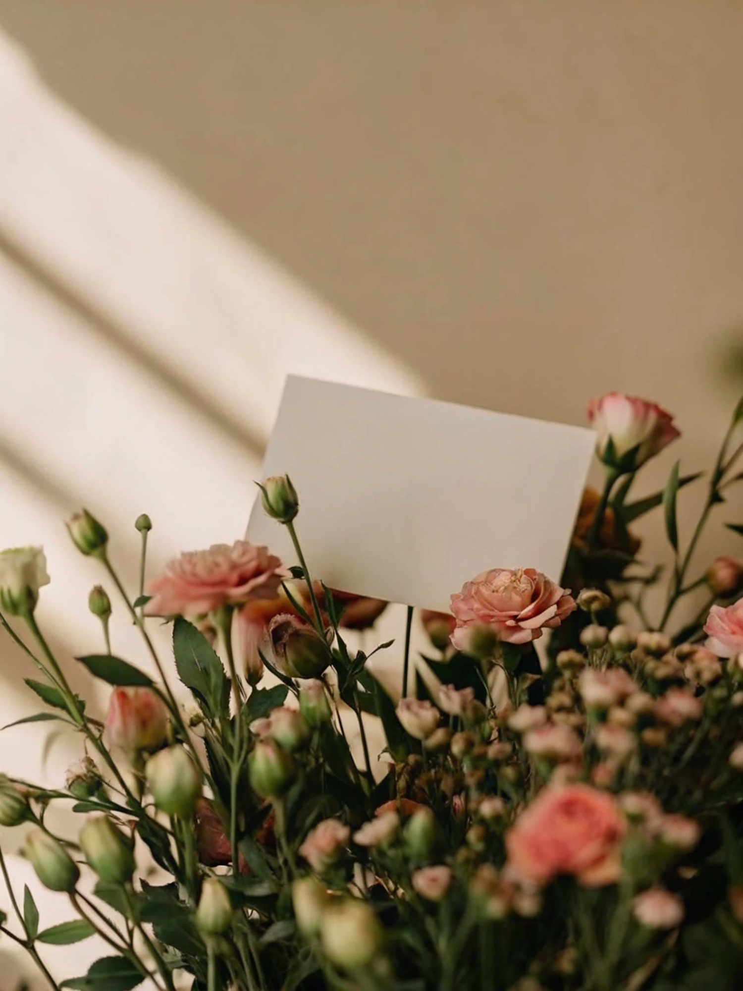 A bouquet of pink roses with a blank card nestled among them, set against a warm beige background with soft lighting.