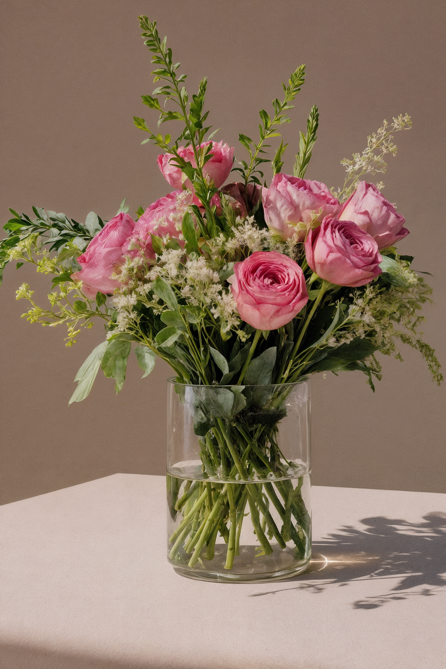 A beautiful bouquet of pink roses and greenery in a clear glass vase, set against a neutral background with soft natural lighting.
