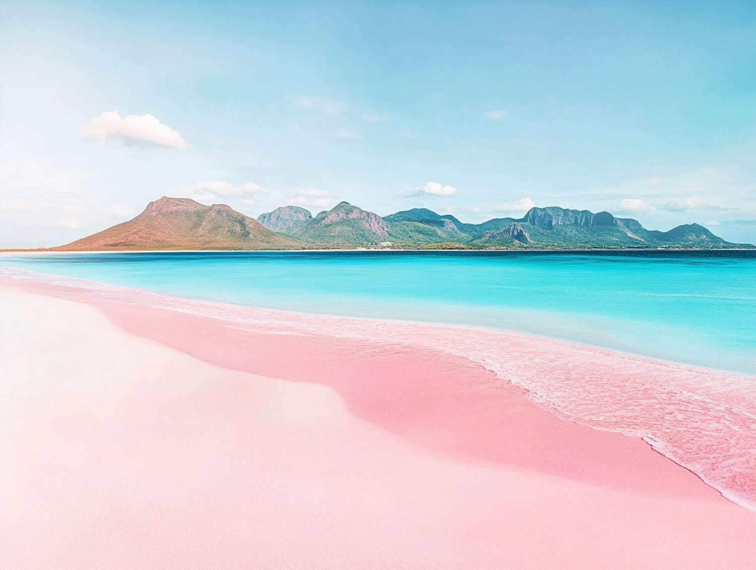 Dreamy pink sand beach with turquoise waters and lush mountains in the background under a clear blue sky.