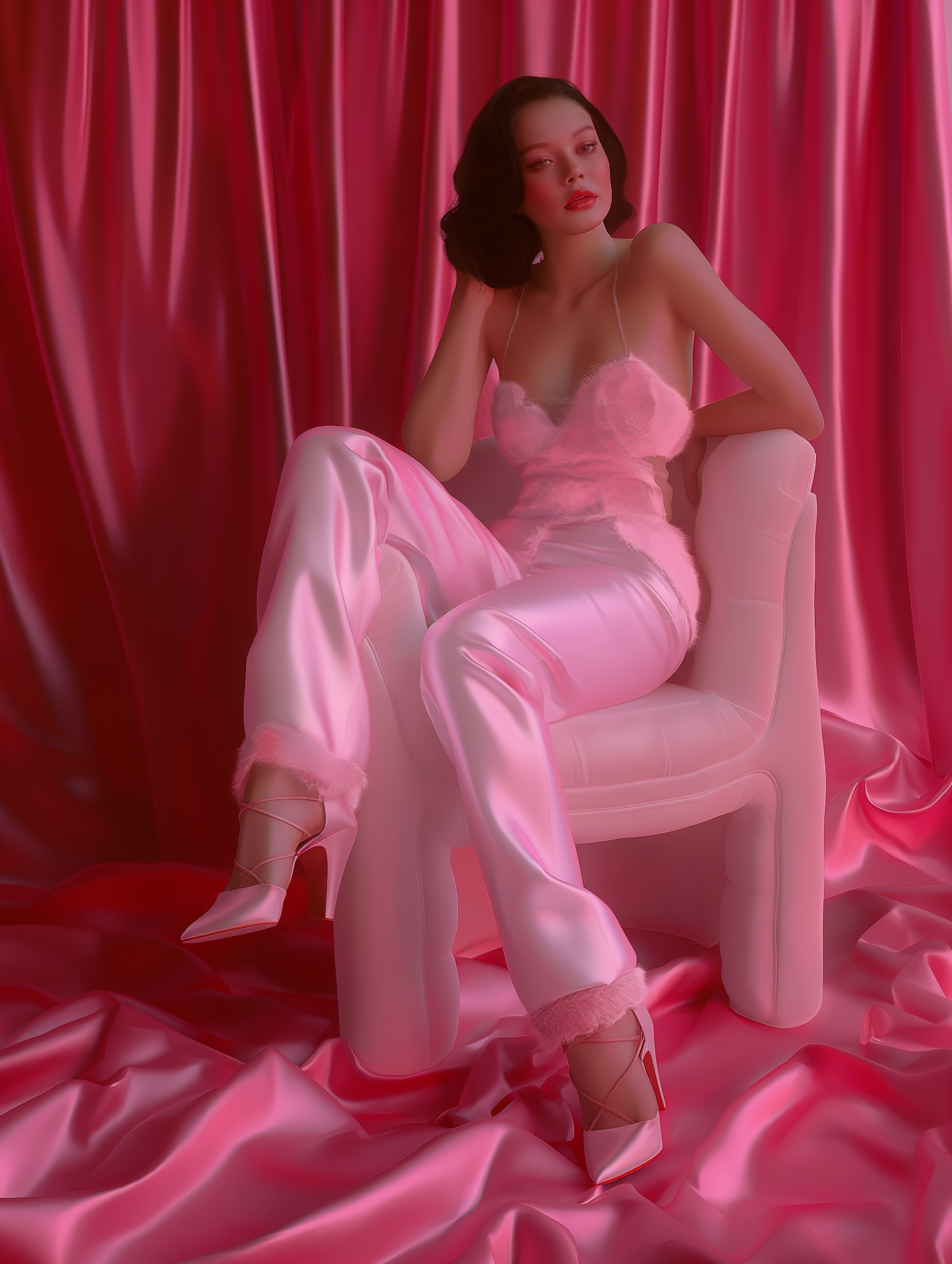 Elegant woman in pink satin and fuzzy top on white chair, surrounded by luxurious pink drapery. Glamorous and sophisticated vibe.