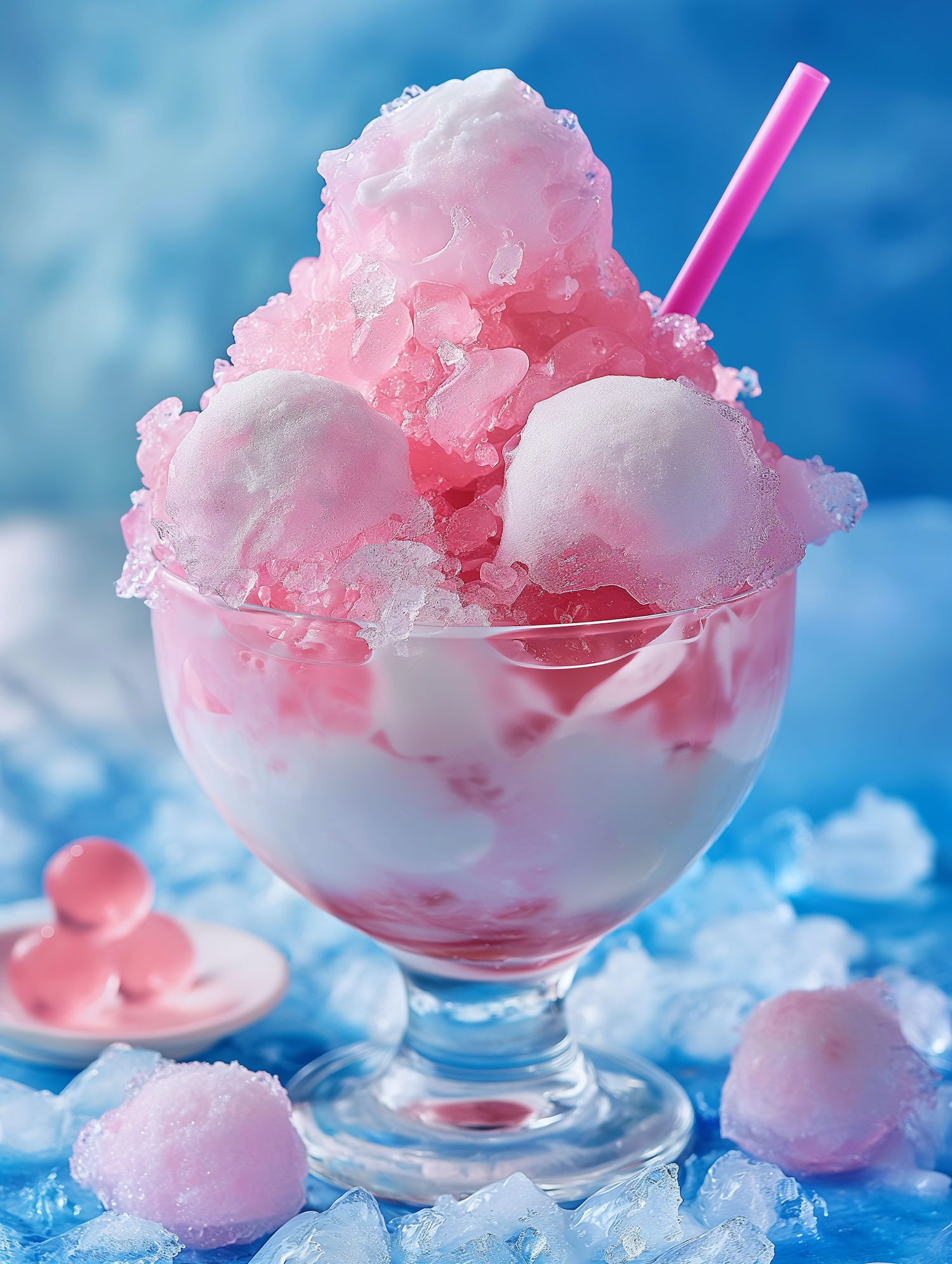 Refreshing pink shaved ice dessert with white ice cream scoops and a pink straw, set against a cool blue background.