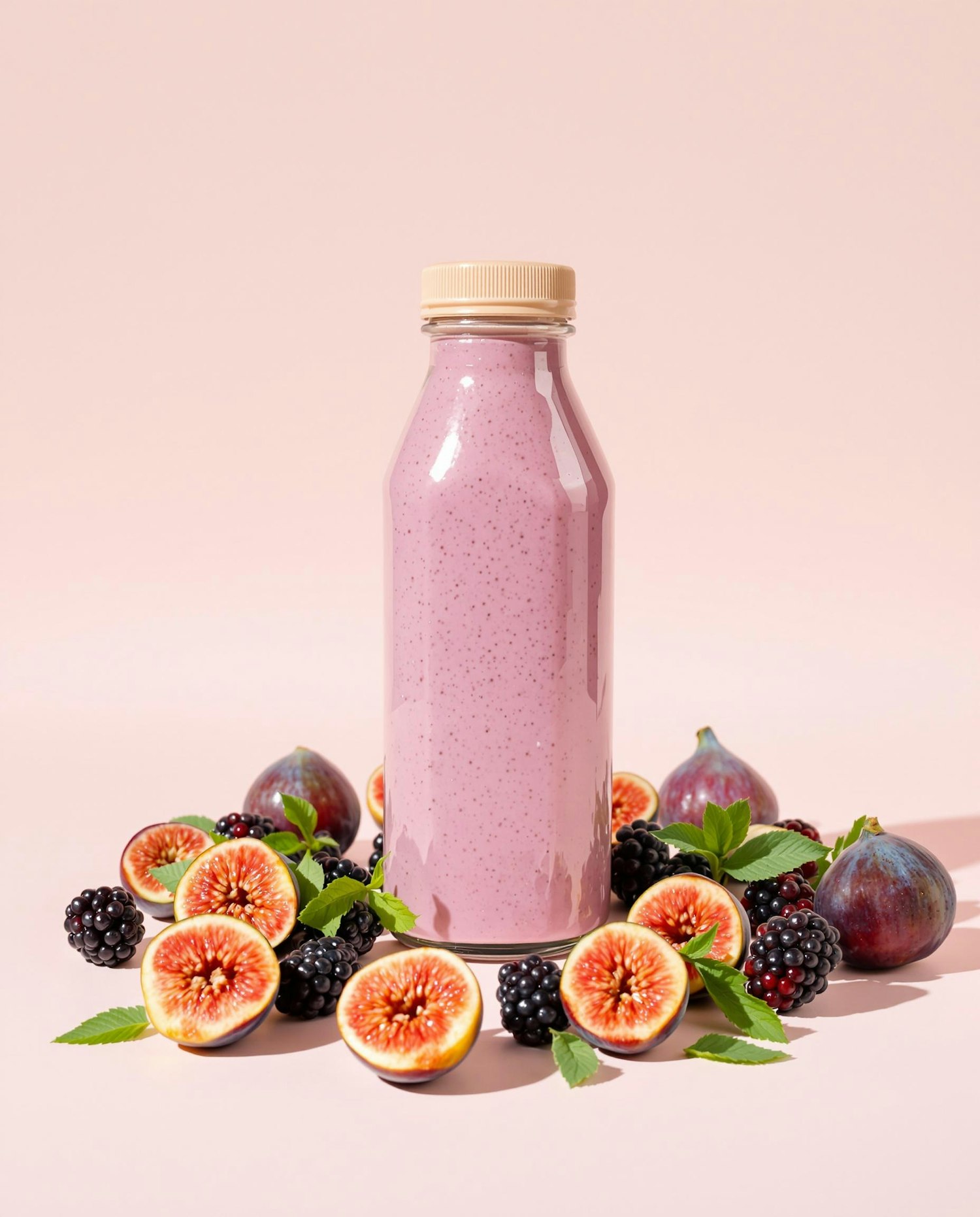 studio photography of a glass juice bottle with a beige cap, placed upright on a pale neutral background, surrounded by neatly arranged and halved fresh fruits, strong natural lighting with soft shadows, clean and aesthetic flat lay composition, minimal yet vibrant look, containing a light purple-pink smoothie, surrounded by halved blackberries, ripe figs, and a few scattered mint leaves for contrast