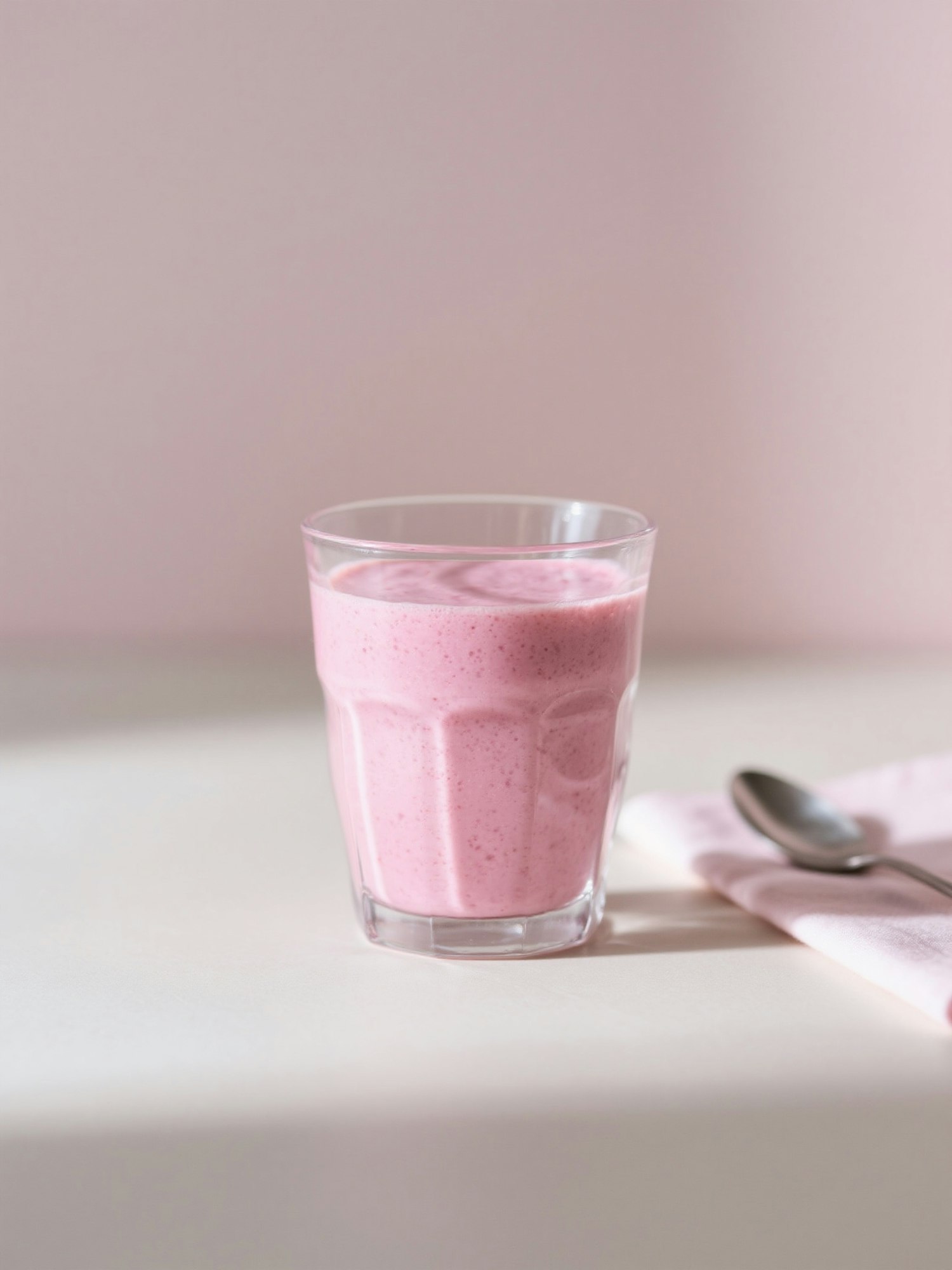 A creamy pink smoothie in a clear glass, paired with a spoon on a pink napkin, set against a soft pink background.
