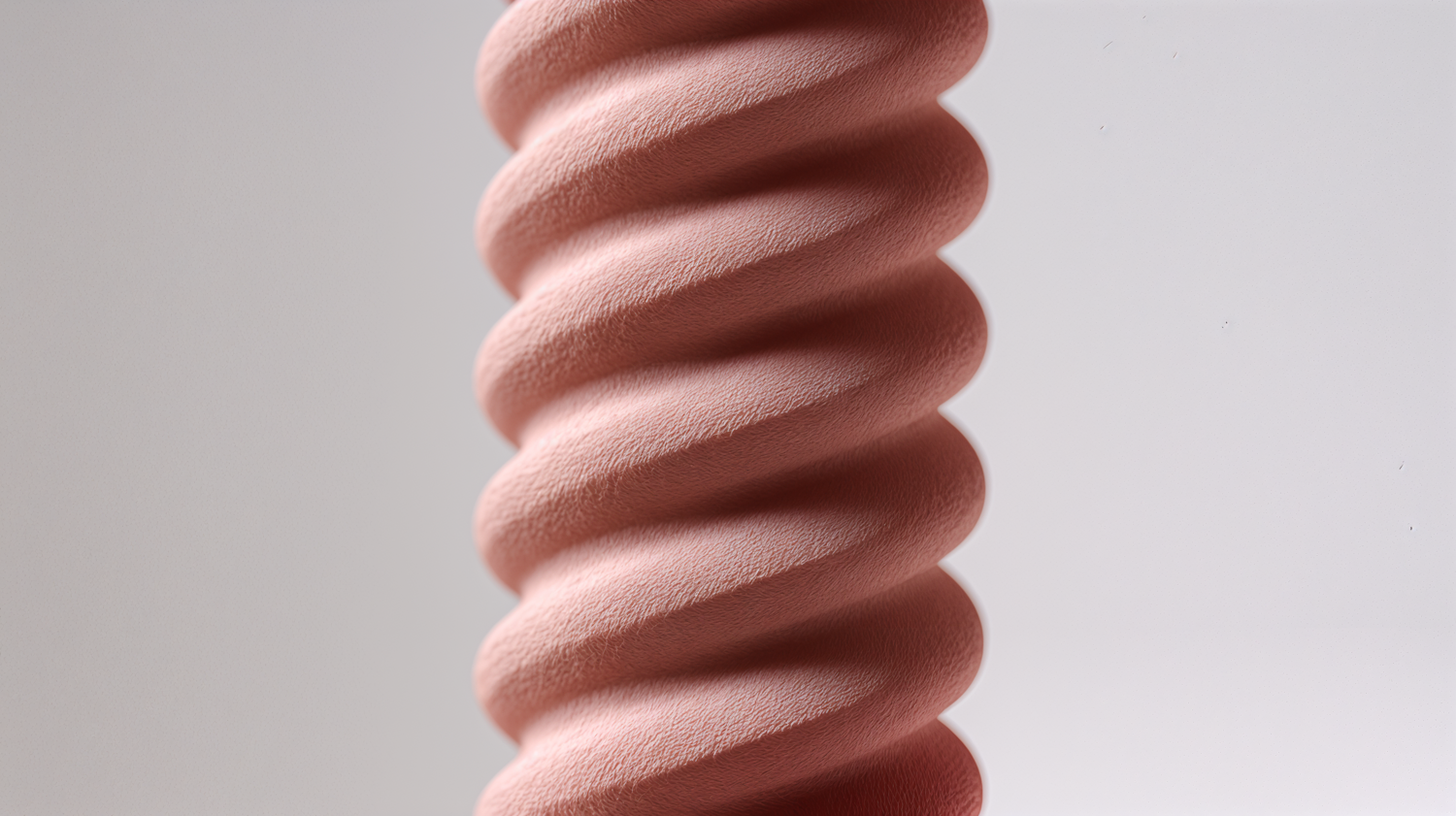 Close-up of a textured pink spiral object against a light gray background, showcasing its intricate design and matte finish.