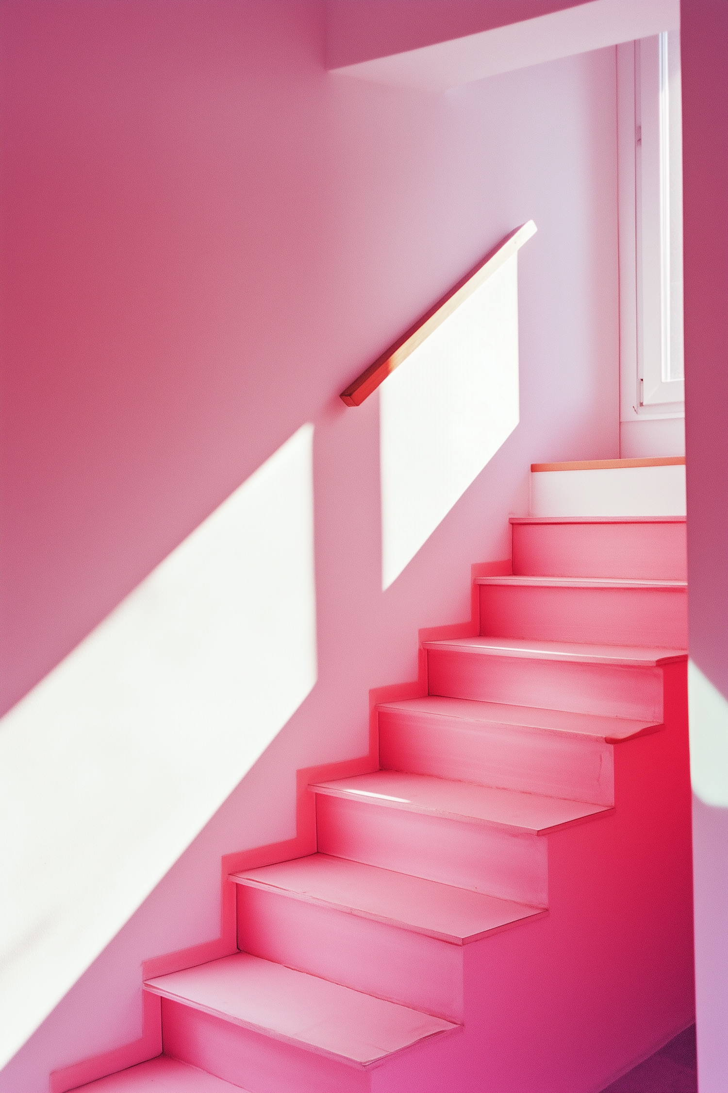 Bright pink staircase with matching walls, wooden handrail, and sunlight casting geometric shadows for a modern, playful aesthetic.