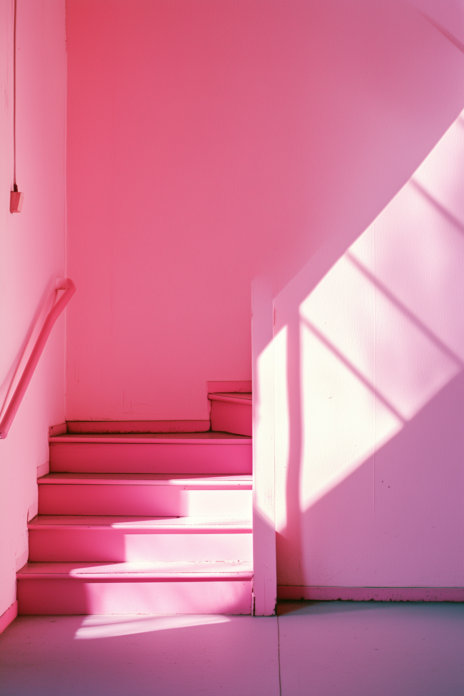Vibrant pink staircase with sunlight casting geometric shadows, creating a bold and modern monochromatic aesthetic.