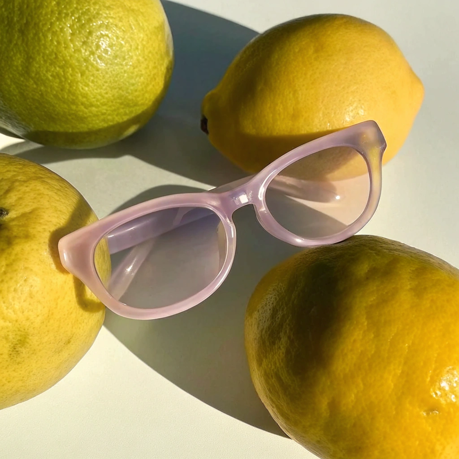 Translucent pink sunglasses paired with vibrant yellow lemons on a white surface, creating a fresh and summery aesthetic.
