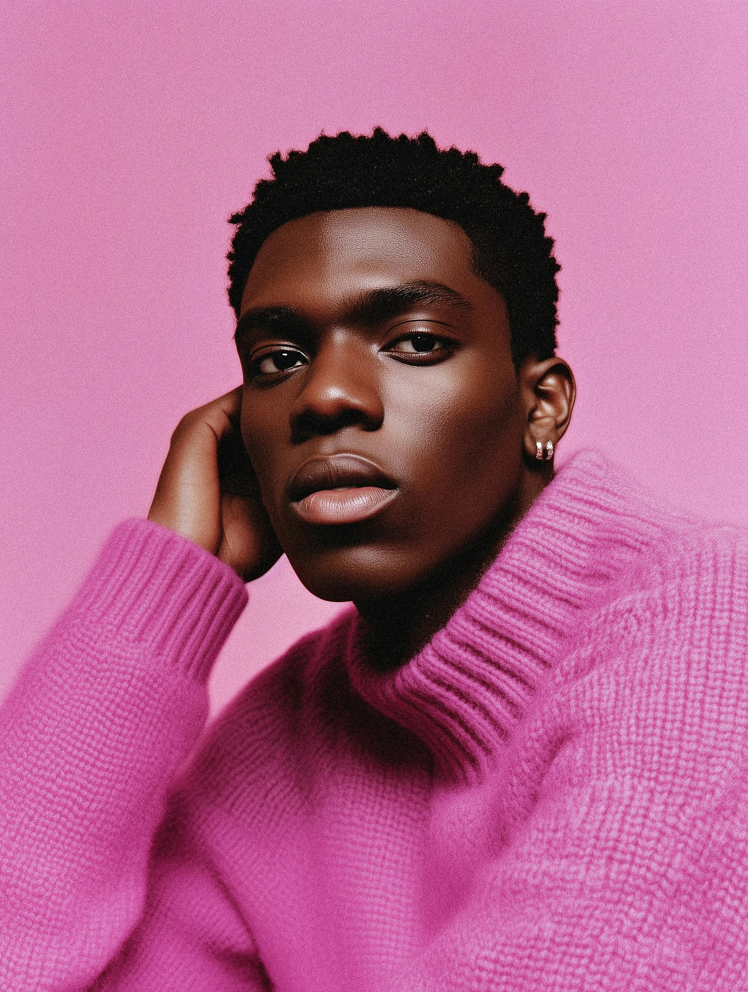 Stylish portrait of a young man in a pink sweater against a matching pink background, exuding calm and elegance.
