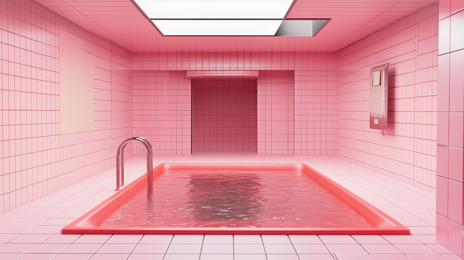 A digitally stylized pink-tiled room featuring a red water pool with clean symmetry and a modern, minimalist design.