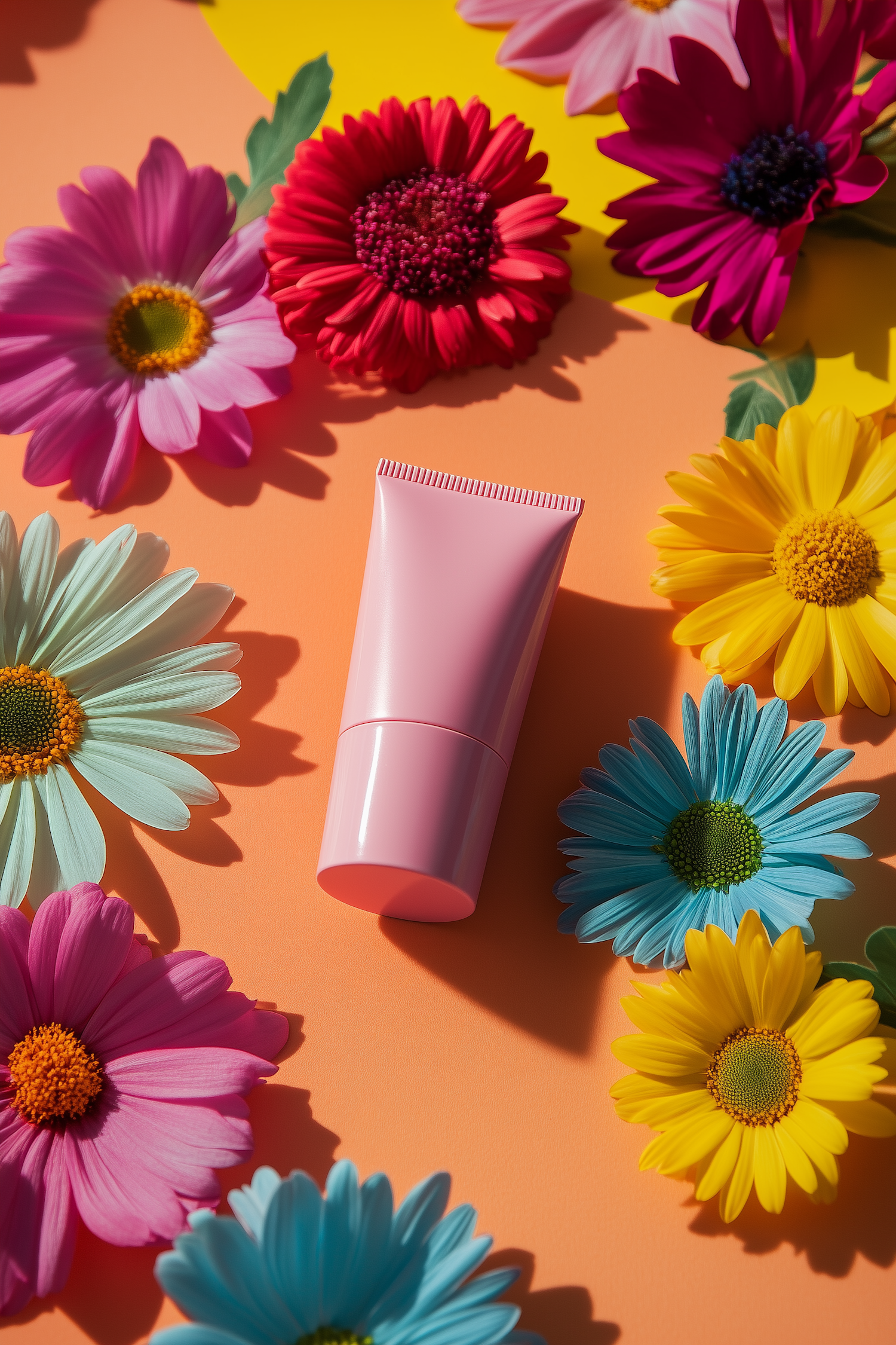 Bright pink cosmetic tube on an orange background surrounded by colorful daisies, creating a cheerful and vibrant aesthetic.