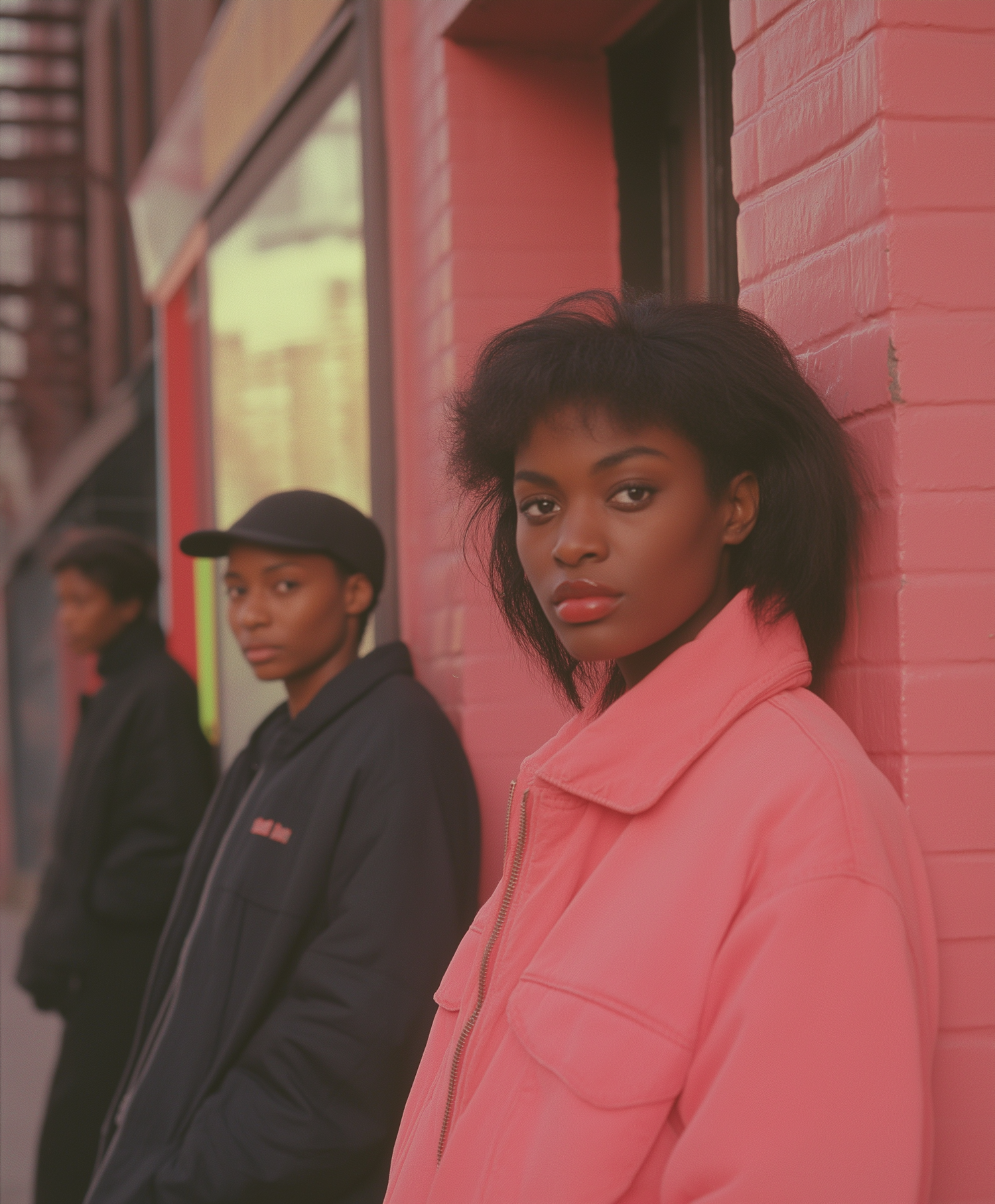 Young Black woman in pink jacket leans against a pink wall, with two others in the background. Urban setting with vibrant colors.