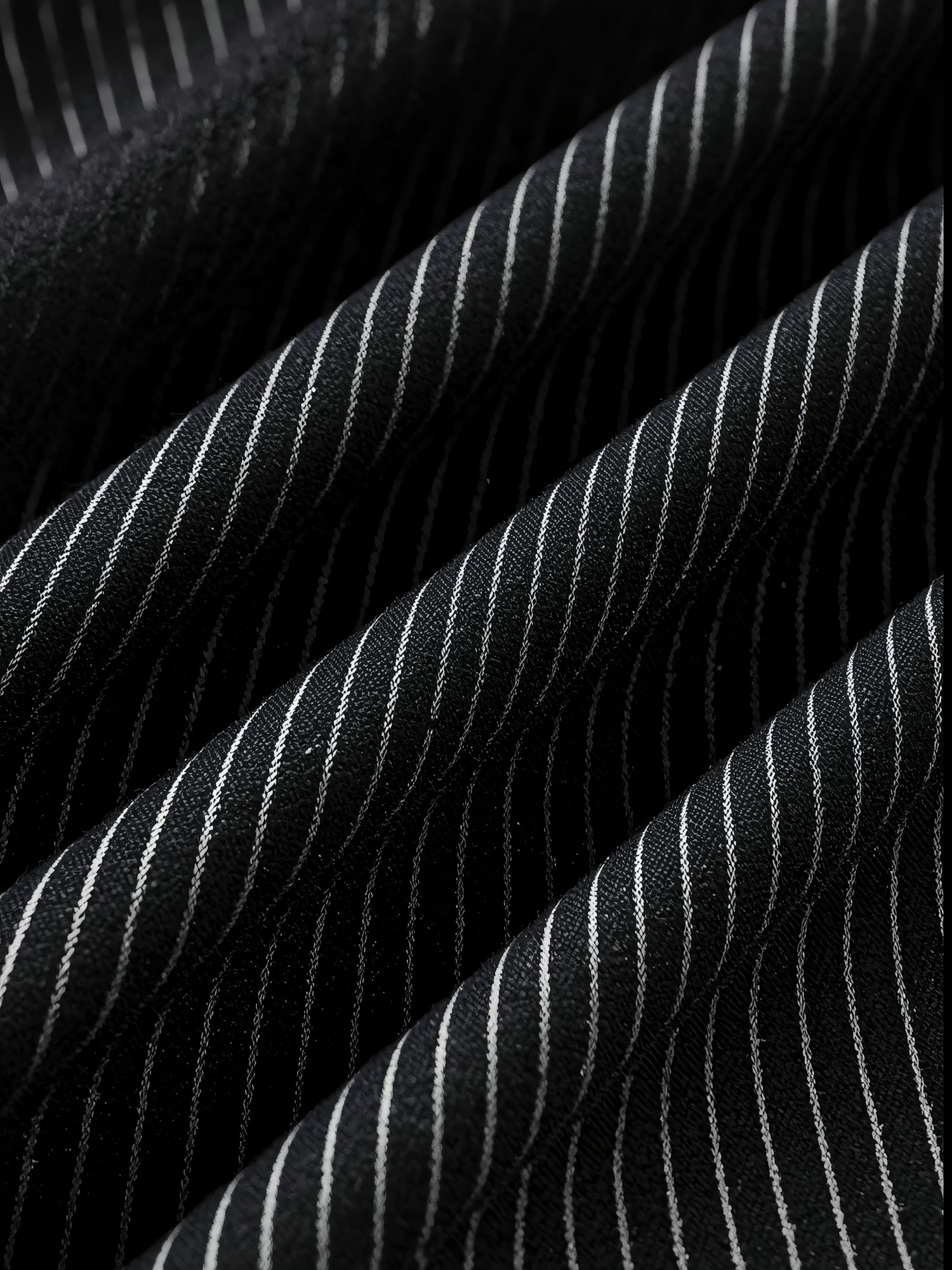 Close-up of black fabric with white pinstripes, showcasing its texture and folds, emphasizing its quality and classic design.