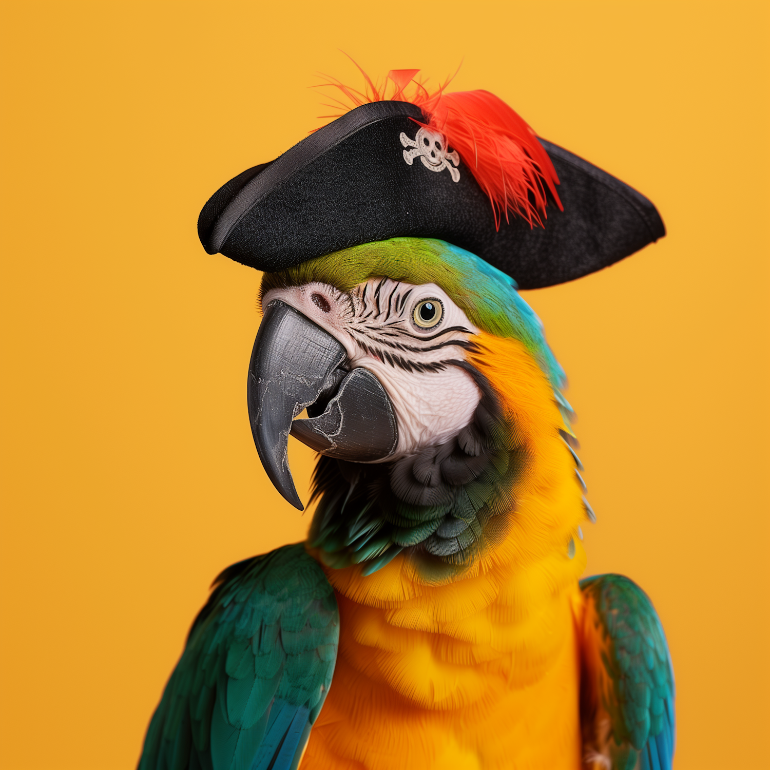 Colorful parrot wearing a pirate hat with a red feather and skull emblem, set against a bright yellow background.